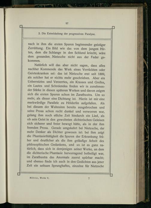 Natürlich will das aber nicht sagen, dass alles nachher Kommende das Werk eines Verrückten oder Geisteskranken sei: das ist Nietzsche erst seit 1889, als solcher hat er nichts mehr geschrieben. Aber ein Ueberreiztes und Verzerrtes, ein Krasses und Grelles, ein Lautes und Schreiendes finden wir in zunehmender Stärke in diesen späteren Werken und davon zeigen sich die ersten Spuren schon im Zarathustra. Um so mehr, als dieser eine Dichtung ist. Hierin ist mir eine merkwürdige Parallele zu Hölderlin aufgefallen. Als bei diesem der Wahnsinn bereits ausgebrochen und seine Prosa schon recht dunkel und verworren war, gelang ihm noch etliche Zeit hindurch ein Lied, als ob sein Geist in den gewohnten dichterischen Geleisen sich sicherer und freier bewegt hätte, als in der ihm fremden Prosa. Gerade umgekehrt bei Nietzsche, der mehr Denker als Dichter gewesen ist: bei ihm zeigt die Phantasiethätigkeit die Spuren der Erkrankung früher und deutlicher als die ihm geläufige Arbeit des philosophischen Gedankens, und so ist es ganz natürlich, dass sich in demjenigen seiner Werke, an dem die dichterische Phantasie hervorragend betheiligt war, im Zarathustra das Anormale zuerst spürbar macht; und ebenso finde ich auch in den Gedichten aus jener Zeit ein seltsam Sprunghaftes, einzelne für Nietzsche