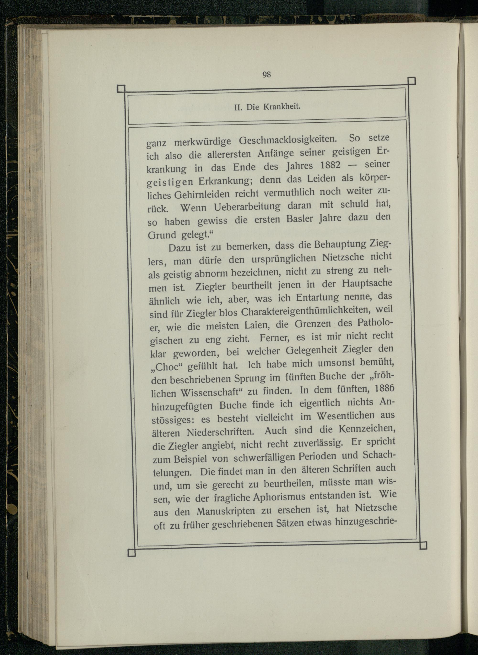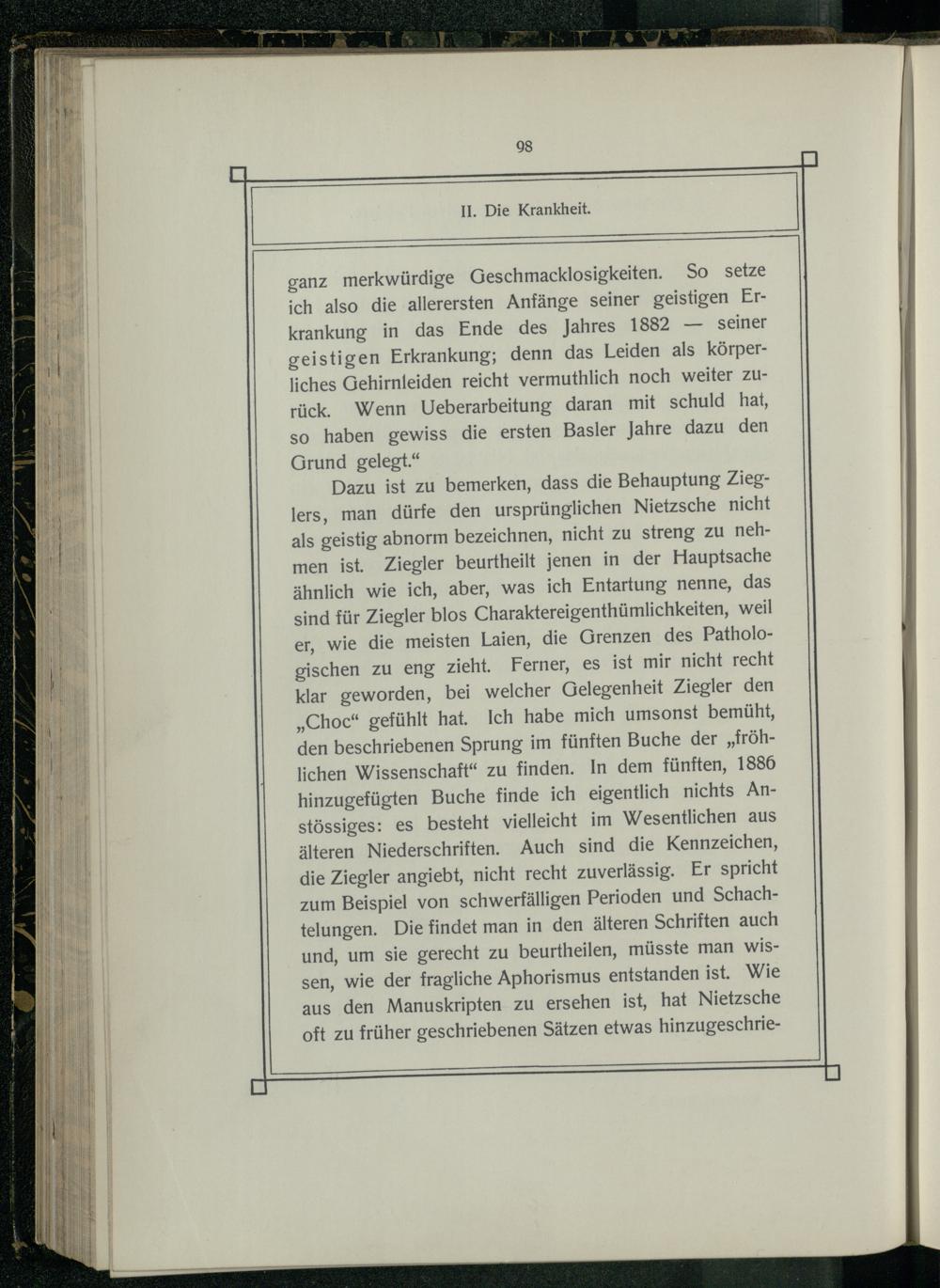 Dazu ist zu bemerken, dass die Behauptung Zieglers, man dürfe den ursprünglichen Nietzsche nicht als geistig abnorm bezeichnen, nicht zu streng zu nehmen ist. Ziegler beurtheilt jenen in der Hauptsache ähnlich wie ich, aber, was ich Entartung nenne, das sind für Ziegler blos Charaktereigenthümlichkeiten, weil er, wie die meisten Laien, die Grenzen des Pathologischen zu eng zieht. Ferner, es ist mir nicht recht klar geworden, bei welcher Gelegenheit Ziegler den „Choc“ gefühlt hat. Ich habe mich umsonst bemüht, den beschriebenen Sprung im fünften Buche der„fröhlichen Wissenschaft“ zu finden. In dem fünften, 1886 hinzugefügten Buche finde ich eigentlich nichts Anstössiges: es besteht vielleicht im Wesentlichen aus älteren Niederschriften. Auch sind die Kennzeichen, die Ziegler angiebt, nicht recht zuverlässig. Er spricht zum Beispiel von schwerfälligen Perioden und Schachtelungen. Die findet man in den älteren Schriften auch und, um sie gerecht zu beurtheilen, müsste man Wwissen, wie der fragliche Aphorismus entstanden ist. Wie aus den Manuskripten zu ersehen ist, hat Nietzsche oft zu früher geschriebenen Sätzen etwas hinzugeschrie