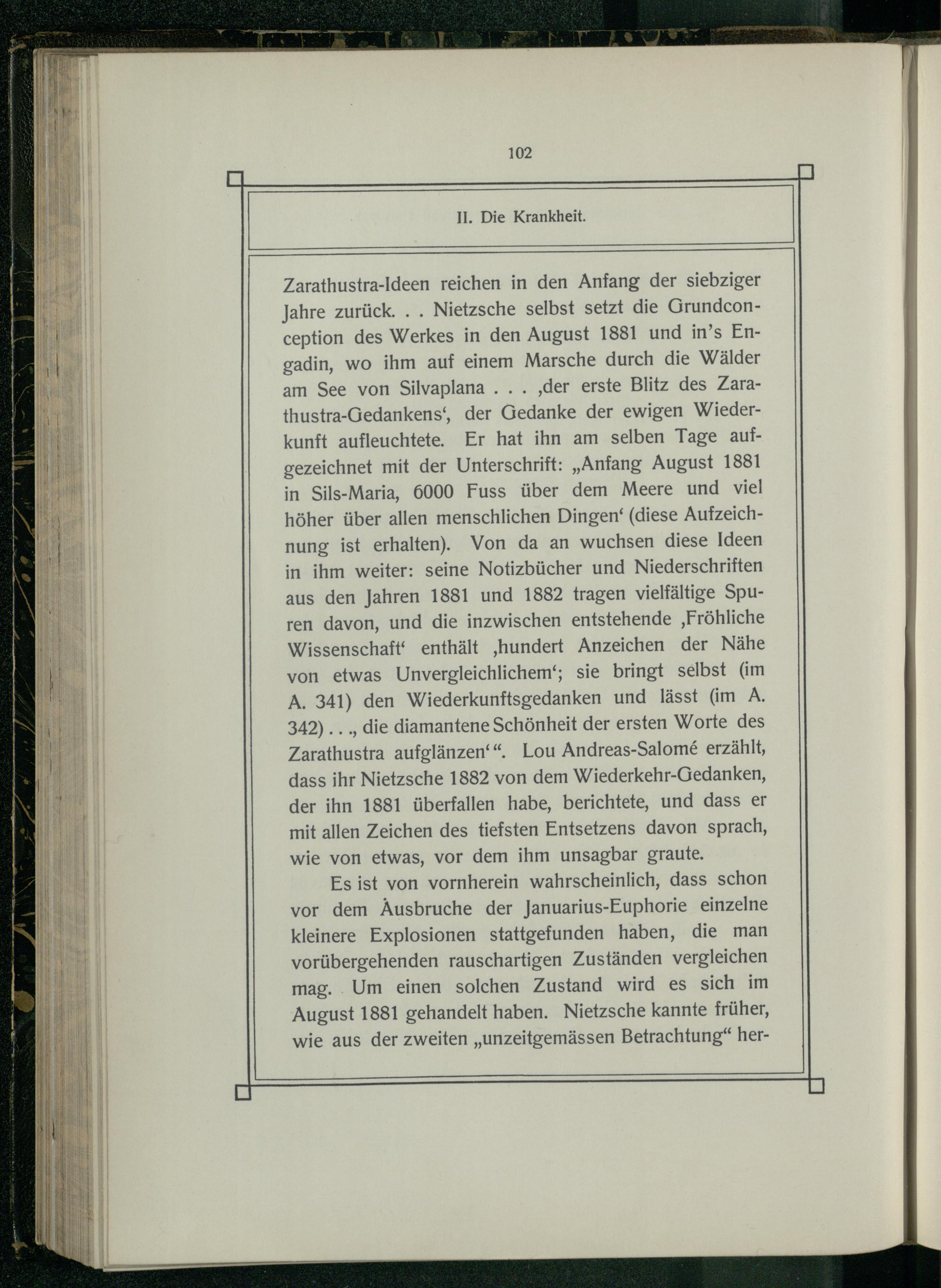 Zarathustra-Ideen reichen in den Anfang der siebziger Jahre zurück... Nietzsche selbst setzt die Grundconception des Werkes in den August 1881 und in’s Engadin, wo ihm auf einem Marsche durch die Wälder am See von Silvaplana... ‚der erste Blitz des Zarathustra-Gedankens‘, der Gedanke der ewigen Wiederkunft aufleuchtete. Er hat ihn am selben Tage aufgezeichnet mit der Unterschrift:„Anfang August 1881 in Sils-Maria, 6000 Fuss über dem Meere und viel höher über allen menschlichen Dingen‘(diese Aufzeichnung ist erhalten). Von da an wuchsen diese Ideen in ihm weiter: seine Notizbücher und Niederschriften aus den Jahren 1881 und 1882 tragen vielfältige Spuren davon, und die inzwischen entstehende ‚Fröhliche Wissenschaft‘ enthält ‚hundert Anzeichen der Nähe von etwas Unvergleichlichem‘; sie bringt selbst(im A. 341) den Wiederkunftsgedanken und lässt(im A. 342)..., die diamantene Schönheit der ersten Worte des Zarathustra aufglänzen‘“. Lou Andreas-Salome erzählt, dass ihr Nietzsche 1882 von dem Wiederkehr-Gedanken, der ihn 1881 überfallen habe, berichtete, und dass er mit allen Zeichen des tiefsten Entsetzens davon sprach, wie von etwas, vor dem ihm unsagbar graute,