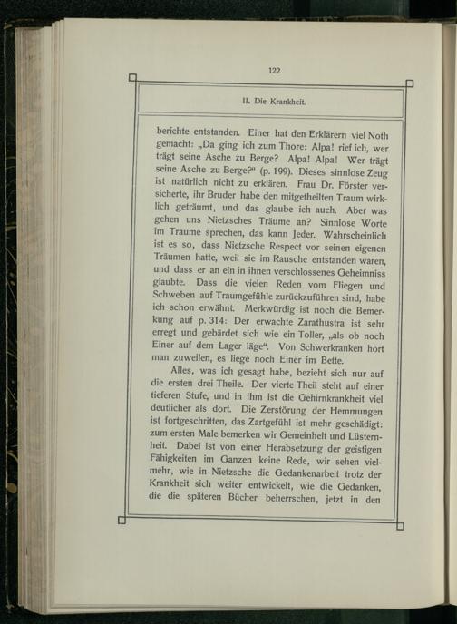 berichte entstanden. Einer hat den Erklärern viel Noth gemacht:„Da ging ich zum Thore: Alpa! rief ich, wer trägt seine Asche zu Berge? Alpa! Alpa! Wer trägt seine Asche zu Berge?“(p. 199). Dieses sinnlose Zeug ist natürlich nicht zu erklären. Frau Dr. Förster versicherte, ihr Bruder habe den mitgetheilten Traum wirklich geträumt, und das glaube ich auch. Aber was gehen uns Nietzsches Träume an? Sinnlose Worte im Traume sprechen, das kann Jeder. Wahrscheinlich ist es so, dass Nietzsche Respect vor seinen eigenen Träumen hatte, weil sie im Rausche entstanden waren, und dass er an ein in ihnen verschlossenes Geheimniss glaubte. Dass die vielen Reden vom Fliegen und Schweben auf Traumgefühle zurückzuführen sind, habe ich schon erwähnt. Merkwürdig ist noch die Bemerkung auf p. 314: Der erwachte Zarathustra ist sehr erregt und gebärdet sich wie ein Toller,„als ob noch Einer auf dem Lager läge“. Von Schwerkranken hört man zuweilen, es liege noch Einer im Bette.
