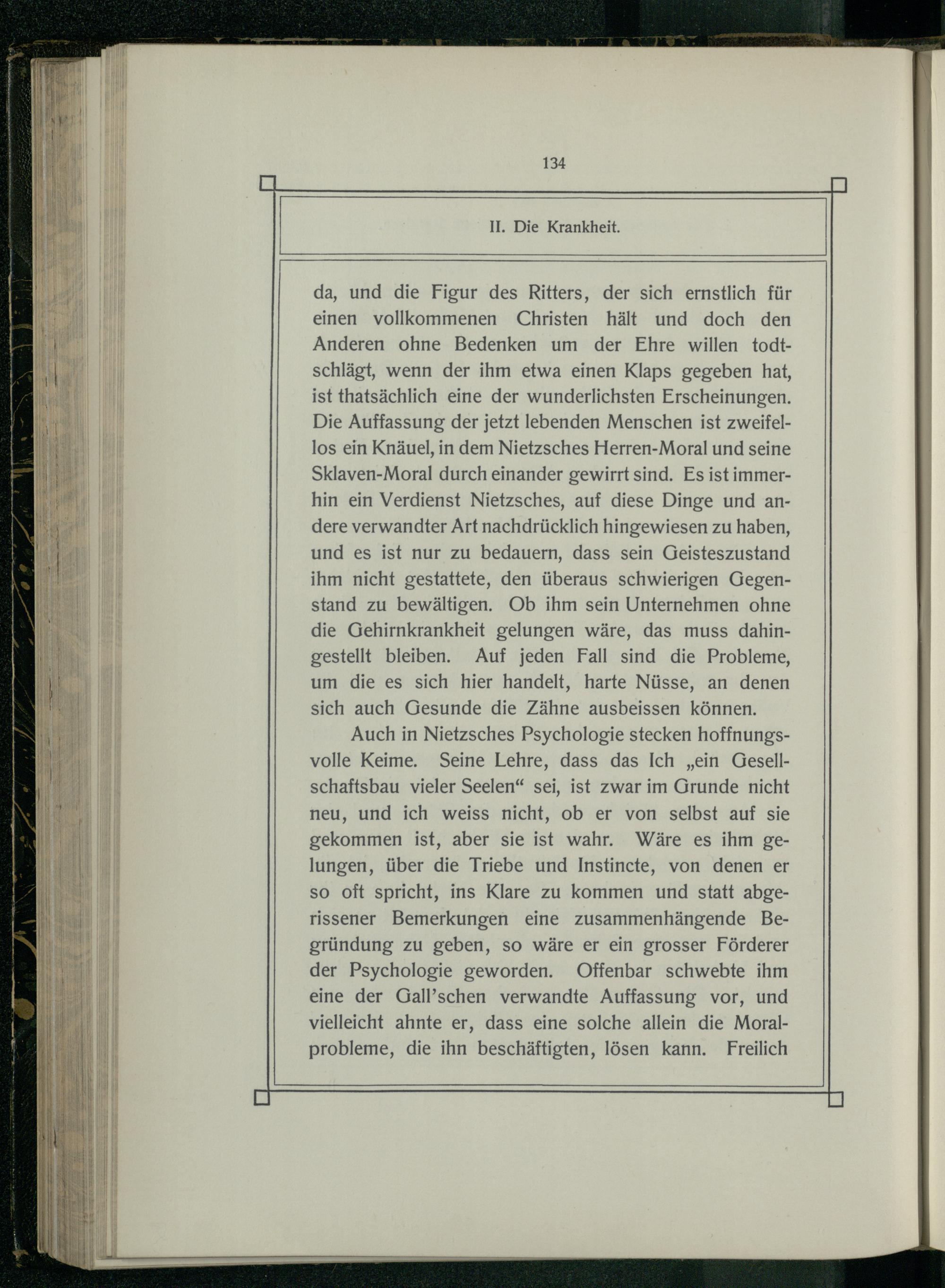 da, und die Figur des Ritters, der sich ernstlich für einen vollkommenen Christen hält und doch den Anderen ohne Bedenken um der Ehre willen todtschlägt, wenn der ihm etwa einen Klaps gegeben hat, ist thatsächlich eine der wunderlichsten Erscheinungen. Die Auffassung der jetzt lebenden Menschen ist zweifellos ein Knäuel, in dem Nietzsches Herren-Moral und seine Sklaven-Moral durch einander gewirrt sind. Es ist immerhin ein Verdienst Nietzsches, auf diese Dinge und andere verwandter Art nachdrücklich hingewiesen zu haben, und es ist nur zu bedauern, dass sein Geisteszustand ihm nicht gestattete, den überaus schwierigen Gegenstand zu bewältigen. Ob ihm sein Unternehmen ohne die Gehirnkrankheit gelungen wäre, das muss dahingestellt bleiben. Auf jeden Fall sind die Probleme, um die es sich hier handelt, harte Nüsse, an denen sich auch Gesunde die Zähne ausbeissen können. Auch in Nietzsches Psychologie stecken hoffnungsvolle Keime. Seine Lehre, dass das Ich„ein Gesellschaftsbau vieler Seelen“ sei, ist zwar im Grunde nicht neu, und ich weiss nicht, ob er von selbst auf sie gekommen ist, aber sie ist wahr. Wäre es ihm gelungen, über die Triebe und Instincte, von denen er so oft spricht, ins Klare zu kommen und statt abgerissener Bemerkungen eine zusammenhängende Begründung zu geben, so wäre er ein grosser Förderer der Psychologie geworden. Offenbar schwebte ihm eine der Gall’schen verwandte Auffassung vor, und vielleicht ahnte er, dass eine solche allein die Moralprobleme, die ihn beschäftigten, lösen kann. Freilich