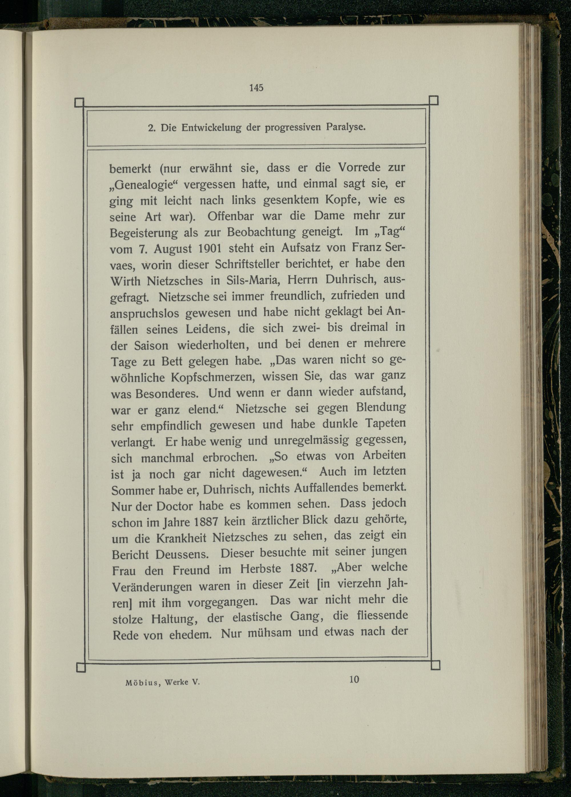 bemerkt(nur erwähnt sie, dass er die Vorrede zur „Genealogie“ vergessen hatte, und einmal sagt sie, er ging mit leicht nach links gesenktem Kopfe, wie es seine Art war). Offenbar war die Dame mehr zur Begeisterung als zur Beobachtung geneigt. Im„Tag“ vom 7. August 1901 steht ein Aufsatz von Franz Servaes, worin dieser Schriftsteller berichtet, er habe den Wirth Nietzsches in Sils-Maria, Herrn Duhrisch, ausgefragt. Nietzsche sei immer freundlich, zufrieden und anspruchslos gewesen und habe nicht geklagt bei Anfällen seines Leidens, die sich zwei- bis dreimal in der Saison wiederholten, und bei denen er mehrere Tage zu Bett gelegen habe.„Das waren nicht so gewöhnliche Kopfschmerzen, wissen Sie, das war ganz was Besonderes. Und wenn er dann wieder aufstand, war er ganz elend.“ Nietzsche sei gegen Blendung sehr empfindlich gewesen und habe dunkle Tapeten verlangt. Er habe wenig und unregelmässig gegessen, sich manchmal erbrochen.„So etwas von Arbeiten ist ja noch gar nicht dagewesen.“ Auch im letzten Sommer habe er, Duhrisch, nichts Auffallendes bemerkt. Nur der Doctor habe es kommen sehen. Dass jedoch schon im Jahre 1887 kein ärztlicher Blick dazu gehörte, um die Krankheit Nietzsches zu sehen, das zeigt ein Bericht Deussens. Dieser besuchte mit seiner jungen Frau den Freund im Herbste 1887.„Aber welche Veränderungen waren in dieser Zeit[in vierzehn Jahren] mit ihm vorgegangen. Das war nicht mehr die stolze Haltung, der elastische Gang, die fliessende Rede von ehedem. Nur mühsam und etwas nach der