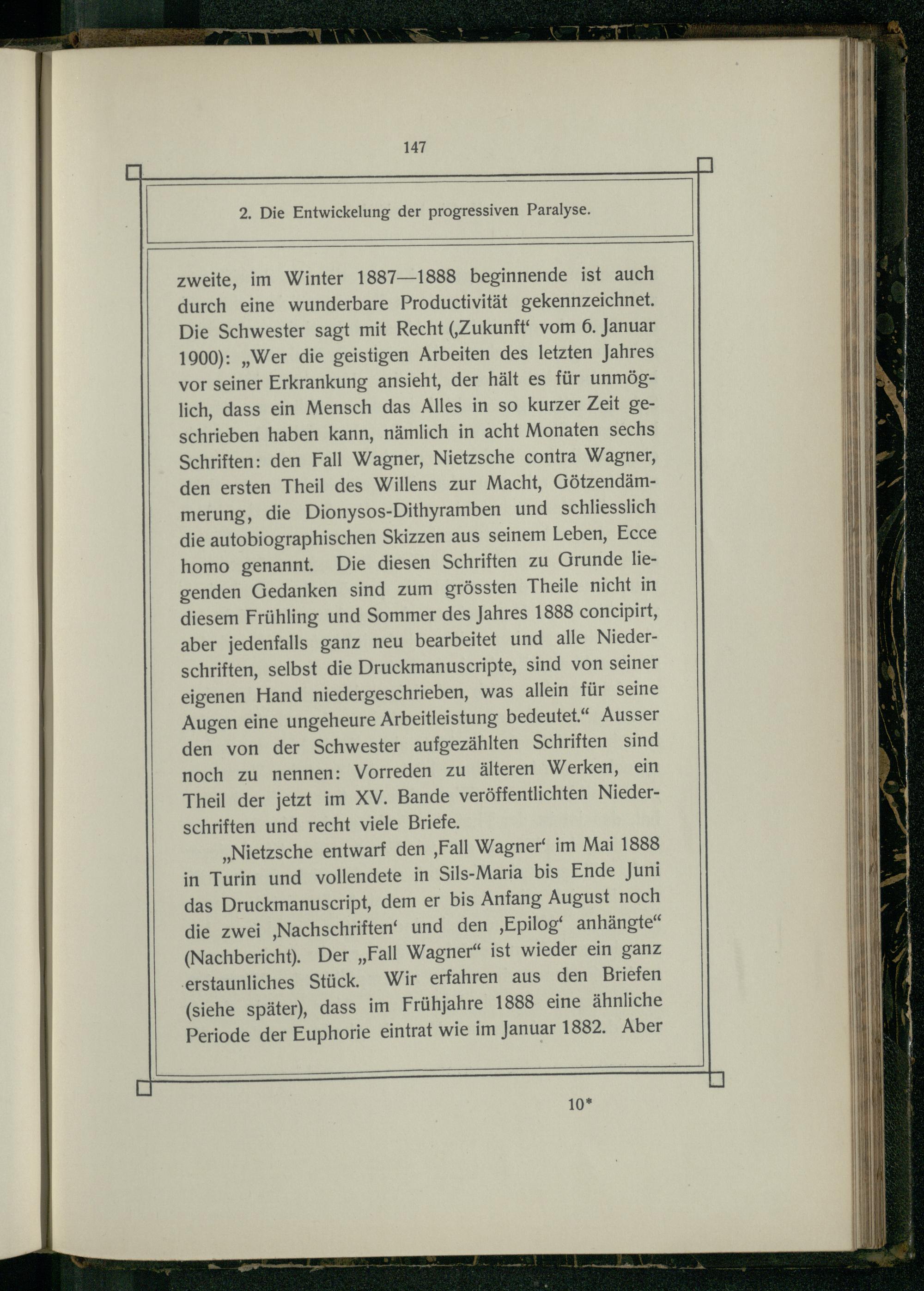 zweite, im Winter 1887—1888 beginnende ist auch durch eine wunderbare Productivität gekennzeichnet. Die Schwester sagt mit Recht(‚Zukunft‘ vom 6. Januar 1900):„Wer die geistigen Arbeiten des letzten Jahres vor seiner Erkrankung ansieht, der hält es für unmöglich, dass ein Mensch das Alles in so kurzer Zeit geschrieben haben kann, nämlich in acht Monaten sechs Schriften: den Fall Wagner, Nietzsche contra Wagner, den ersten Theil des Willens zur Macht, Götzendämmerung, die Dionysos-Dithyramben und schliesslich die autobiographischen Skizzen aus seinem Leben, Ecce homo genannt. Die diesen Schriften zu Grunde liegenden Gedanken sind zum grössten Theile nicht in diesem Frühling und Sommer des Jahres 1888 concipirt, aber jedenfalls ganz neu bearbeitet und alle Niederschriften, selbst die Druckmanuscripte, sind von seiner eigenen Hand niedergeschrieben, was allein für seine Augen eine ungeheure Arbeitleistung bedeutet.“ Ausser den von der Schwester aufgezählten Schriften sind noch zu nennen: Vorreden zu älteren Werken, ein Theil der jetzt im XV. Bande veröffentlichten Niederschriften und recht viele Briefe.