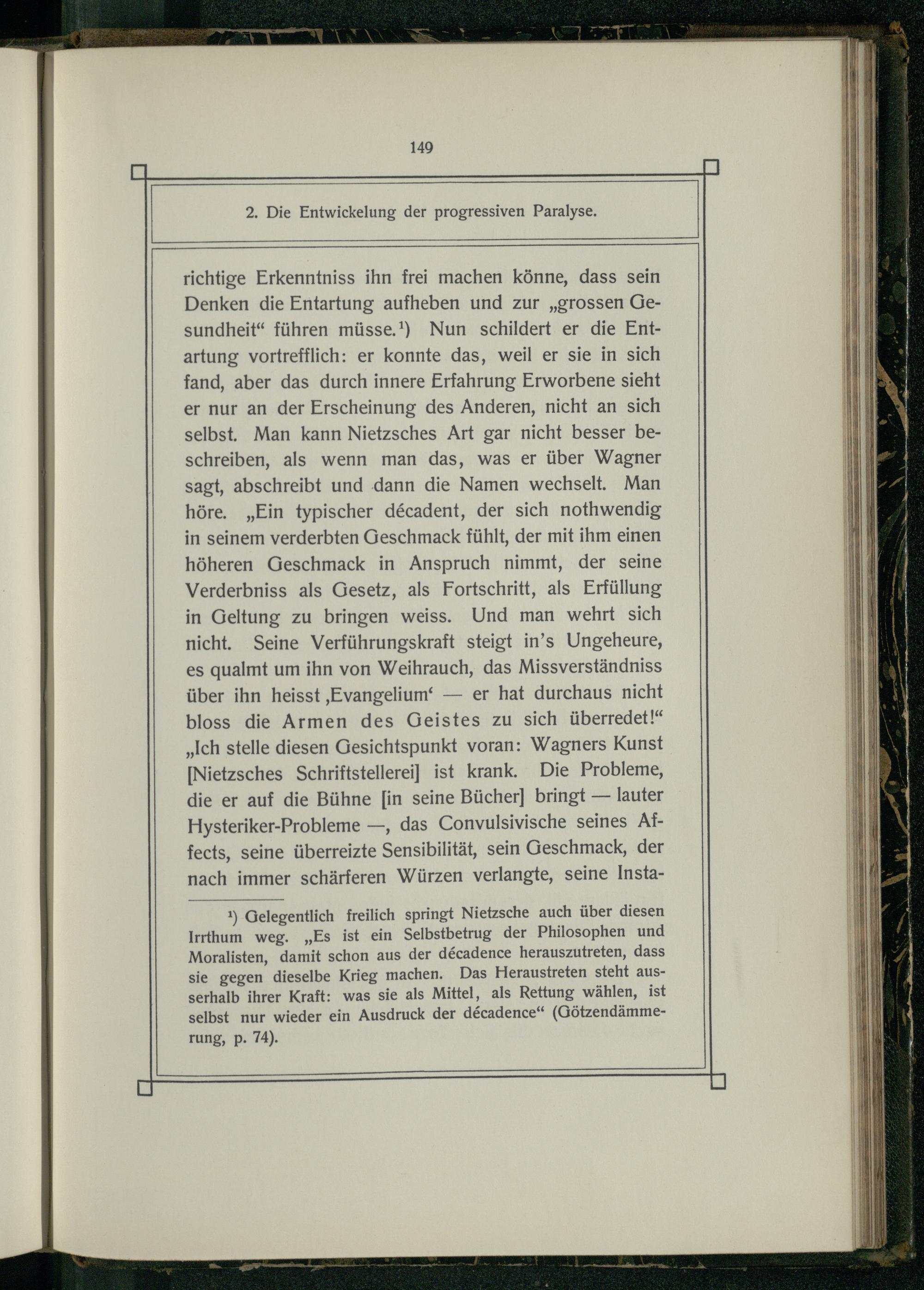 1) Gelegentlich freilich springt Nietzsche auch über diesen Irrthum weg.„Es ist ein Selbstbetrug der Philosophen und Moralisten, damit schon aus der d&cadence herauszutreten, dass sie gegen dieselbe Krieg machen. Das Heraustreten steht ausserhalb ihrer Kraft: was sie als Mittel, als Rettung wählen, ist selbst nur wieder ein Ausdruck der d&cadence“(Götzendämmerung, p. 74).