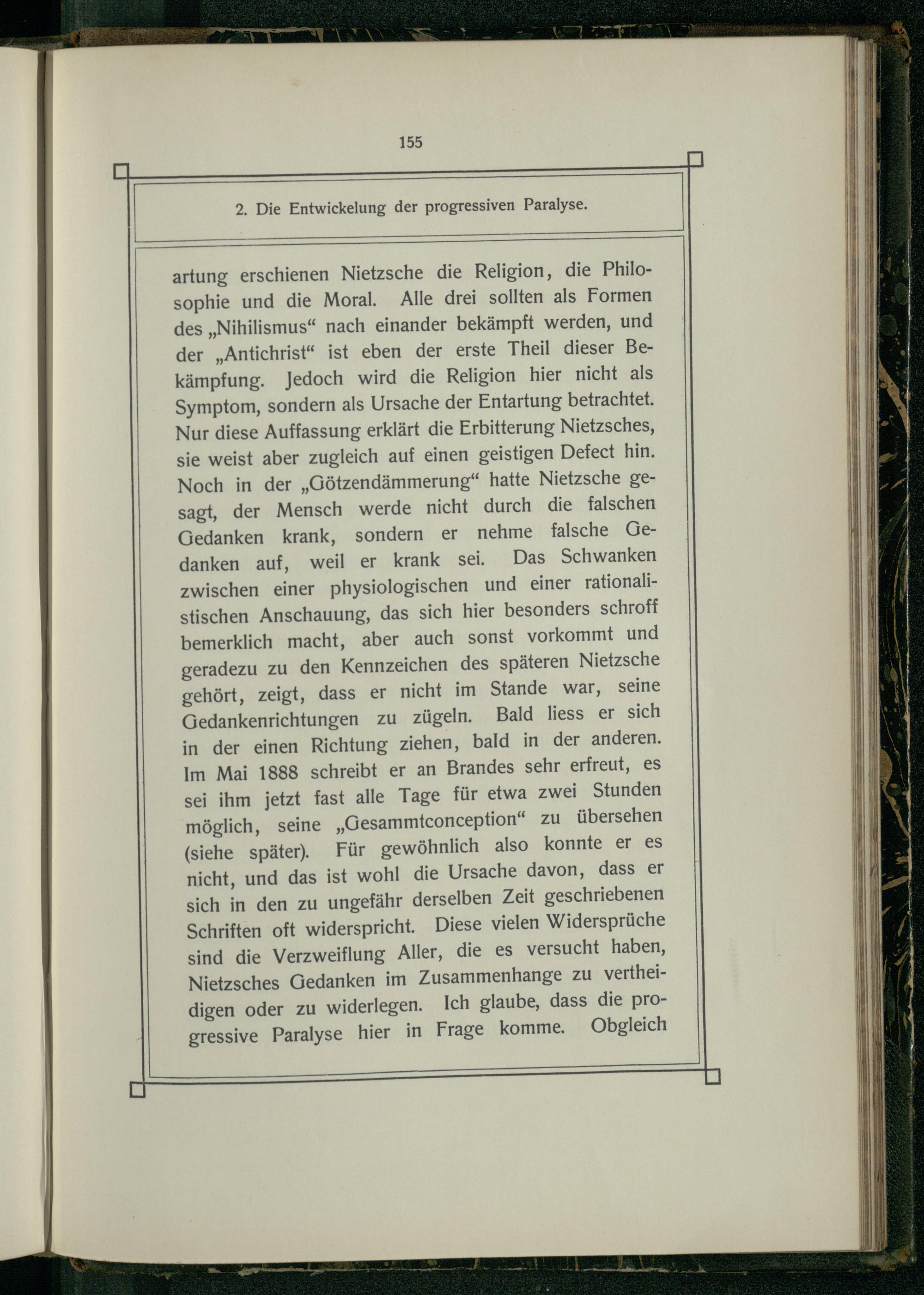 artung erschienen Nietzsche die Religion, die Philosophie und die Moral. Alle drei sollten als Formen des„Nihilismus“ nach einander bekämpft werden, und der„Antichrist“ ist eben der erste Theil dieser Bekämpfung. Jedoch wird die Religion hier nicht als Symptom, sondern als Ursache der Entartung betrachtet. Nur diese Auffassung erklärt die Erbitterung Nietzsches, sie weist aber zugleich auf einen geistigen Defect hin. Noch in der„Götzendämmerung“ hatte Nietzsche gesagt, der Mensch werde nicht durch die falschen Gedanken krank, sondern er nehme falsche Gedanken auf, weil er krank Sei. Das Schwanken zwischen einer physiologischen und einer rationalistischen Anschauung, das sich hier besonders schroff bemerklich macht, aber auch sonst vorkommt und geradezu zu den Kennzeichen des späteren Nietzsche gehört, zeigt, dass er nicht im Stande war, seine Gedankenrichtungen zu zügeln. Bald liess er sich in der einen Richtung ziehen, bald in der anderen. Im Mai 1888 schreibt er an Brandes sehr erfreut, es sei ihm jetzt fast alle Tage für etwa zwei Stunden möglich, seine„Gesammtconception“ zu übersehen (siehe später). Für gewöhnlich also konnte er es nicht, und das ist wohl die Ursache davon, dass er sich in den zu ungefähr derselben Zeit geschriebenen Schriften oft widerspricht. Diese vielen Widersprüche sind die Verzweiflung Aller, die es versucht haben, Nietzsches Gedanken im Zusammenhange zu vertheidigen oder zu widerlegen. Ich glaube, dass die progressive Paralyse hier in Frage komme. Obgleich