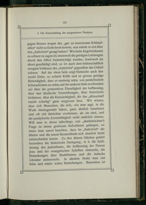 gegen Strauss wegen des„gar zu monotonen Schimpfstiles“ nicht zu Ende lesen konnte, was würde er erst über den„Antichrist“ gesagt haben? Wie beim Angetrunkenen es schwer zu sagen ist, inwieweit die geistigen Leistungen durch den Affect beeinträchtigt werden, inwieweit sie direct geschädigt sind, so ist auch dem leidenschaftlich erregten Verfasser des„Antichrist“ gegenüber das Urtheil schwer. Auf der einen Seite zeigt Nietzsche auch hier soviel Geist, so scharfe Kritik und so grosse geistige Behendigkeit, dass es unsinnig wäre, von paralytischem Schwachsinne zu reden, auf der anderen Seite erschrecken wir über die grenzenlose Einseitigkeit der Auffassung, über fast kindische Vermuthungen, über historische Irrthümer, über die Kurzsichtigkeit, die das„allzuscharf macht schartig“ ganz vergessen liess. Wir wissen, dass sich Menschen, die sich, wie man sagt, in die Wuth hineingeredet haben, ganz ähnlich benehmen und oft viel thörichter erscheinen, als sie sind, und die paralytische Zornmüthigkeit wirkt natürlich ebenso, Will man in dieser(allerdings rein„akademischen“ Frage zu einem gewissen Aufschlusse gelangen, So muss man zuerst beachten, dass im„Antichrist“ die älteren und die neuen Bestandtheile sich ziemlich leicht unterscheiden lassen. Zu den älteren Stücken gehört besonders die historische Darlegung, d. h. die Schilderung des Judenthums, die Auffassung der Person Jesu und der evangelischen Schriften einerseits, die Bemerkungen über Buddhismus und die indische Literatur andererseits. In alledem findet man viel feine und relativ wahre Bemerkungen. Besonders ist