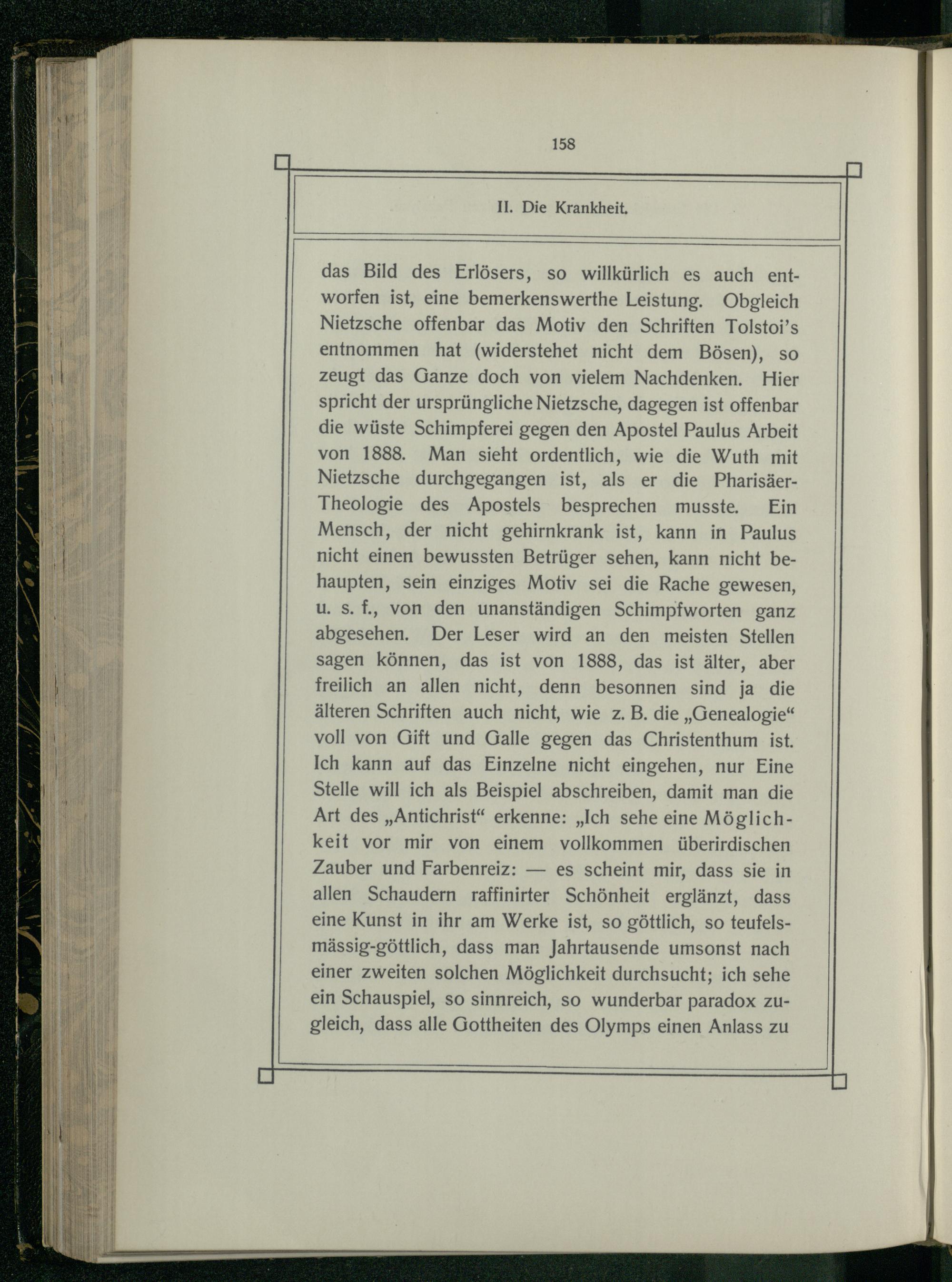das Bild des Erlösers, so willkürlich es auch entworfen ist, eine bemerkenswerthe Leistung. Obgleich Nietzsche offenbar das Motiv den Schriften Tolstoi’s entnommen hat(widerstehet nicht dem Bösen), so zeugt das Ganze doch von vielem Nachdenken. Hier spricht der ursprüngliche Nietzsche, dagegen ist offenbar die wüste Schimpferei gegen den Apostel Paulus Arbeit von 1888. Man sieht ordentlich, wie die Wuth mit Nietzsche durchgegangen ist, als er die PharisäerTheologie des Apostels besprechen musste. Ein Mensch, der nicht gehirnkrank ist, kann in Paulus nicht einen bewussten Betrüger sehen, kann nicht behaupten, sein einziges Motiv sei die Rache gewesen, u. s. f., von den unanständigen Schimpfworten ganz abgesehen. Der Leser wird an den meisten Stellen sagen können, das ist von 1888, das ist älter, aber freilich an allen nicht, denn besonnen sind ja die älteren Schriften auch nicht, wie z.B. die„Genealogie“ voll von Gift und Galle gegen das Christenthum ist. Ich kann auf das Einzelne nicht eingehen, nur Eine Stelle will ich als Beispiel abschreiben, damit man die Art des„Antichrist“ erkenne:„Ich sehe eine Möglichkeit vor mir von einem vollkommen überirdischen Zauber und Farbenreiz:— es scheint mir, dass sie in allen Schaudern raffinirter Schönheit erglänzt, dass eine Kunst in ihr am Werke ist, so göttlich, so teufelsmässig-göttlich, dass man Jahrtausende umsonst nach einer zweiten solchen Möglichkeit durchsucht; ich sehe ein Schauspiel, so sinnreich, so wunderbar paradox zugleich, dass alle Gottheiten des Olymps einen Anlass zu