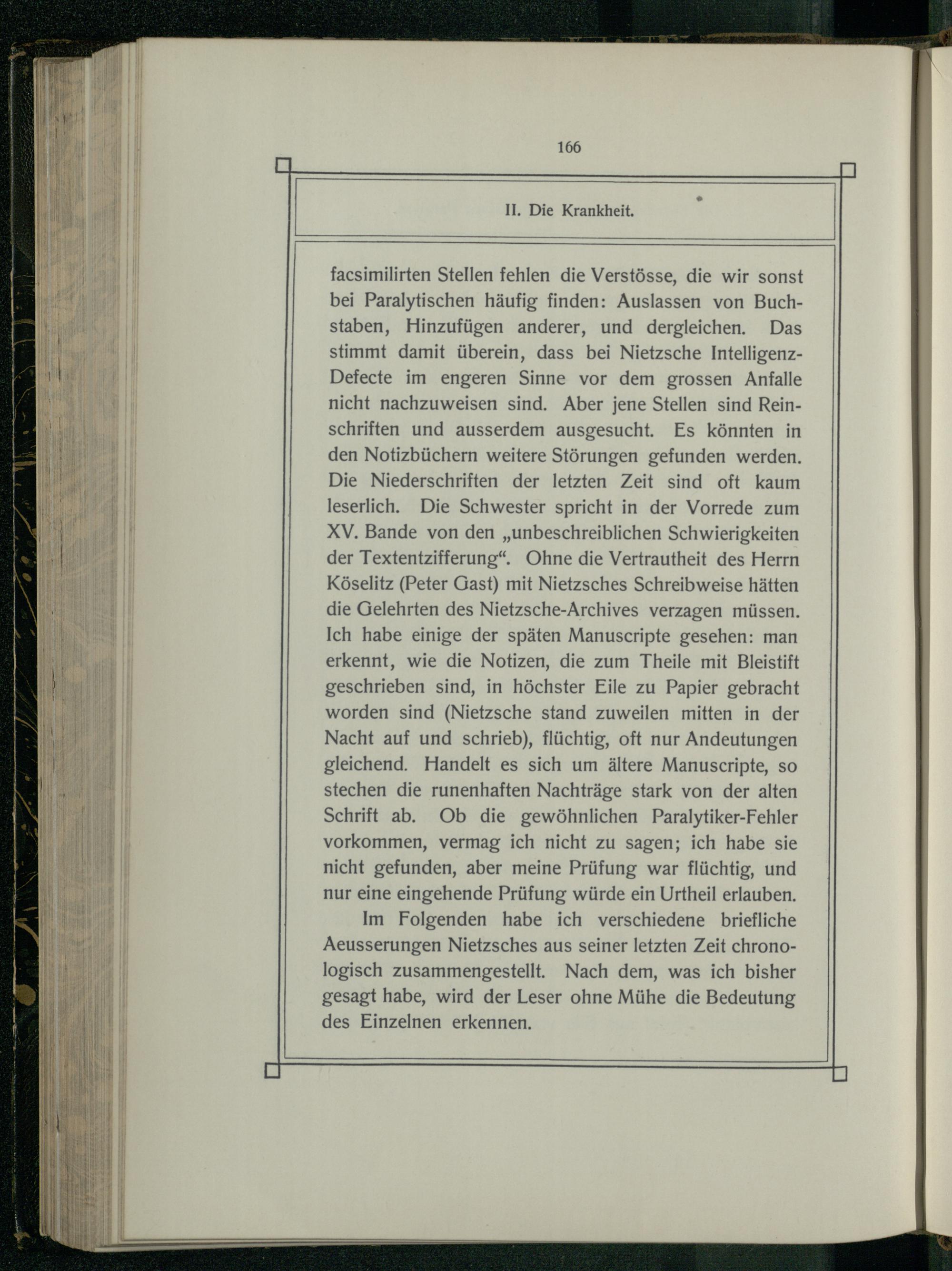 facsimilirten Stellen fehlen die Verstösse, die wir sonst bei Paralytischen häufig finden: Auslassen von Buchstaben, Hinzufügen anderer, und dergleichen. Das stimmt damit überein, dass bei Nietzsche IntelligenzDefecte im engeren Sinne vor dem grossen Anfalle nicht nachzuweisen sind. Aber jene Stellen sind Reinschriften und ausserdem ausgesucht. Es könnten in den Notizbüchern weitere Störungen gefunden werden. Die Niederschriften der letzten Zeit sind oft kaum leserlich. Die Schwester spricht in der Vorrede zum XV. Bande von den„unbeschreiblichen Schwierigkeiten der Textentzifferung“. Ohne die Vertrautheit des Herrn Köselitz(Peter Gast) mit Nietzsches Schreibweise hätten die Gelehrten des Nietzsche-Archives verzagen müssen. Ich habe einige der späten Manuscripte gesehen: man erkennt, wie die Notizen, die zum Theile mit Bleistift geschrieben sind, in höchster Eile zu Papier gebracht worden sind(Nietzsche stand zuweilen mitten in der Nacht auf und schrieb), flüchtig, oft nur Andeutungen gleichend. Handelt es sich um ältere Manuscripte, so stechen die runenhaften Nachträge stark von der alten Schrift ab. Ob die gewöhnlichen Paralytiker-Fehler vorkommen, vermag ich nicht zu sagen; ich habe sie nicht gefunden, aber meine Prüfung war flüchtig, und nur eine eingehende Prüfung würde ein Urtheil erlauben.