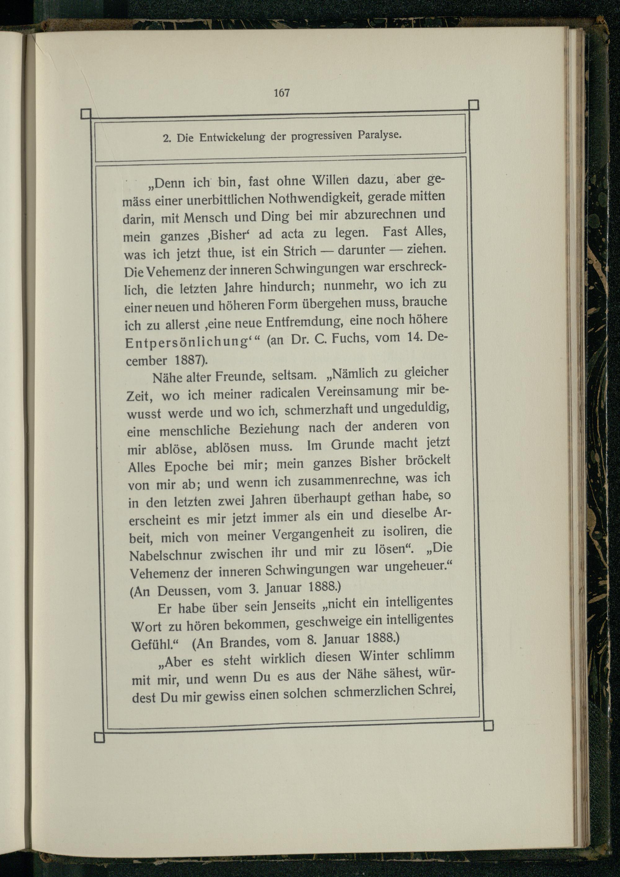 Nähe alter Freunde, seltsam.„Nämlich zu gleicher Zeit, wo ich meiner radicalen Vereinsamung mir bewusst werde und wo ich, schmerzhaft und ungeduldig, eine menschliche Beziehung nach der anderen von mir ablöse, ablösen muss. Im Grunde macht jetzt Alles Epoche bei mir; mein ganzes Bisher bröckelt von mir ab; und wenn ich zusammenrechne, was ich in den letzten zwei Jahren überhaupt gethan habe, so erscheint es mir jetzt immer als ein und dieselbe Arbeit, mich von meiner Vergangenheit zu isoliren, die Nabelschnur zwischen ihr und mir zu lösen“.„Die Vehemenz der inneren Schwingungen war ungeheuer.“ (An Deussen, vom 3. Januar 1888.)