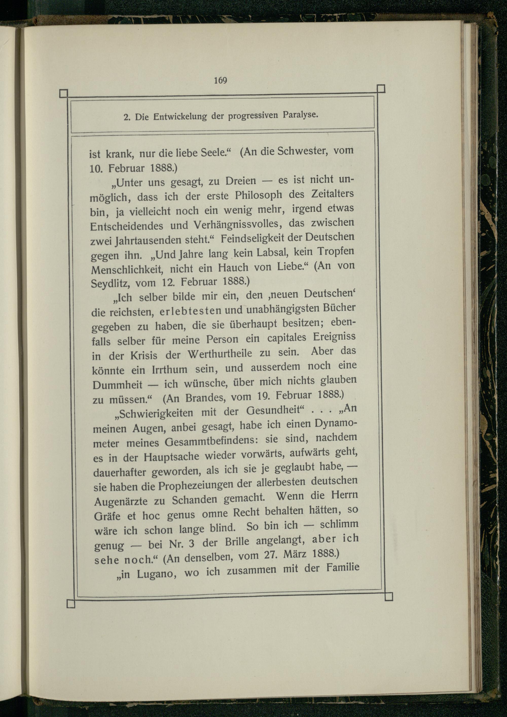 „Schwierigkeiten mit der Gesundheit“...„An meinen Augen, anbei gesagt, habe ich einen Dynamometer meines Gesammtbefindens: sie sind, nachdem es in der Hauptsache wieder vorwärts, aufwärts geht, dauerhafter geworden, als ich sie je geglaubt habe,— sie haben die Prophezeiungen der allerbesten deutschen Augenärzte zu Schanden gemacht. Wenn die Herrn Gräfe et hoc genus omne Recht behalten hätten, so wäre ich schon lange blind. So bin ich— schlimm genug— bei Nr. 3 der Brille angelangt, aber ich sehe noch.“(An denselben, vom 27. März 1888.)