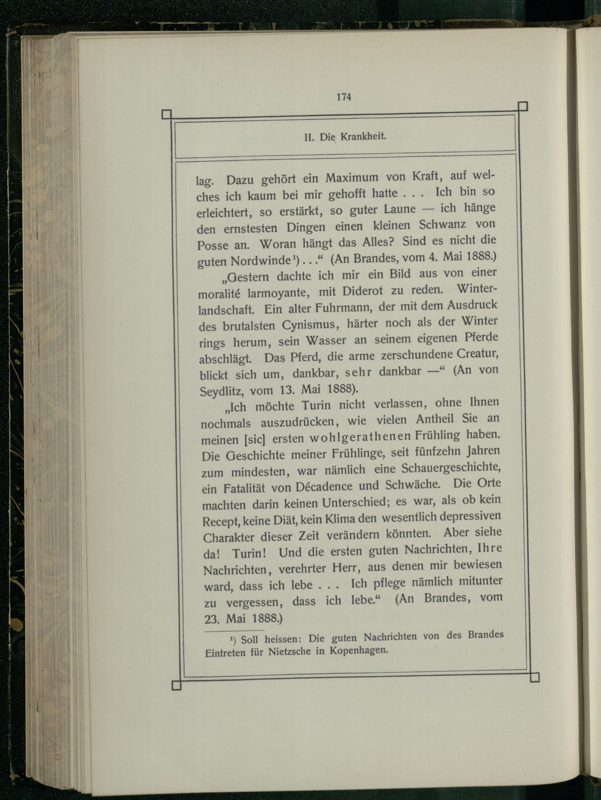 „Ich möchte Turin nicht verlassen, ohne Ihnen nochmals auszudrücken, wie vielen Antheil Sie an meinen[sic] ersten wohlgerathenen Frühling haben. Die Geschichte meiner Frühlinge, seit fünfzehn Jahren zum mindesten, war nämlich eine Schauergeschichte, ein Fatalität von D6cadence und Schwäche. Die Orte machten darin keinen Unterschied; es war, als ob kein Recept, keine Diät, kein Klima den wesentlich depressiven Charakter dieser Zeit verändern könnten. Aber siehe da! Turin! Und die ersten guten Nachrichten, Ihre Nachrichten, verehrter Herr, aus denen mir bewiesen ward, dass ich lebe... Ich pflege nämlich mitunter zu vergessen, dass ich lebe.“(An Brandes, vom 23. Mai 1888.)