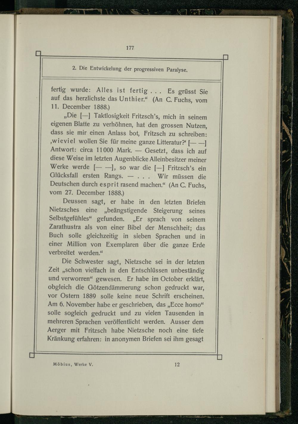 „Die[—] Taktlosigkeit Fritzsch’s, mich in seinem eigenen Blatte zu verhöhnen, hat den grossen Nutzen, dass sie mir einen Anlass bot, Fritzsch zu schreiben: ‚wieviel wollen Sie für meine ganze Litteratur?-—— Antwort: circa 11000 Mark.— Gesetzt, dass ich auf diese Weise im letzten Augenblicke Alleinbesitzer meiner Werke werde[——], so war die[—] Fritzsch’s ein Glücksfall ersten Rangs.—... Wir müssen die Deutschen durch esprit rasend machen.“(An C. Fuchs, vom 27. December 1888.)