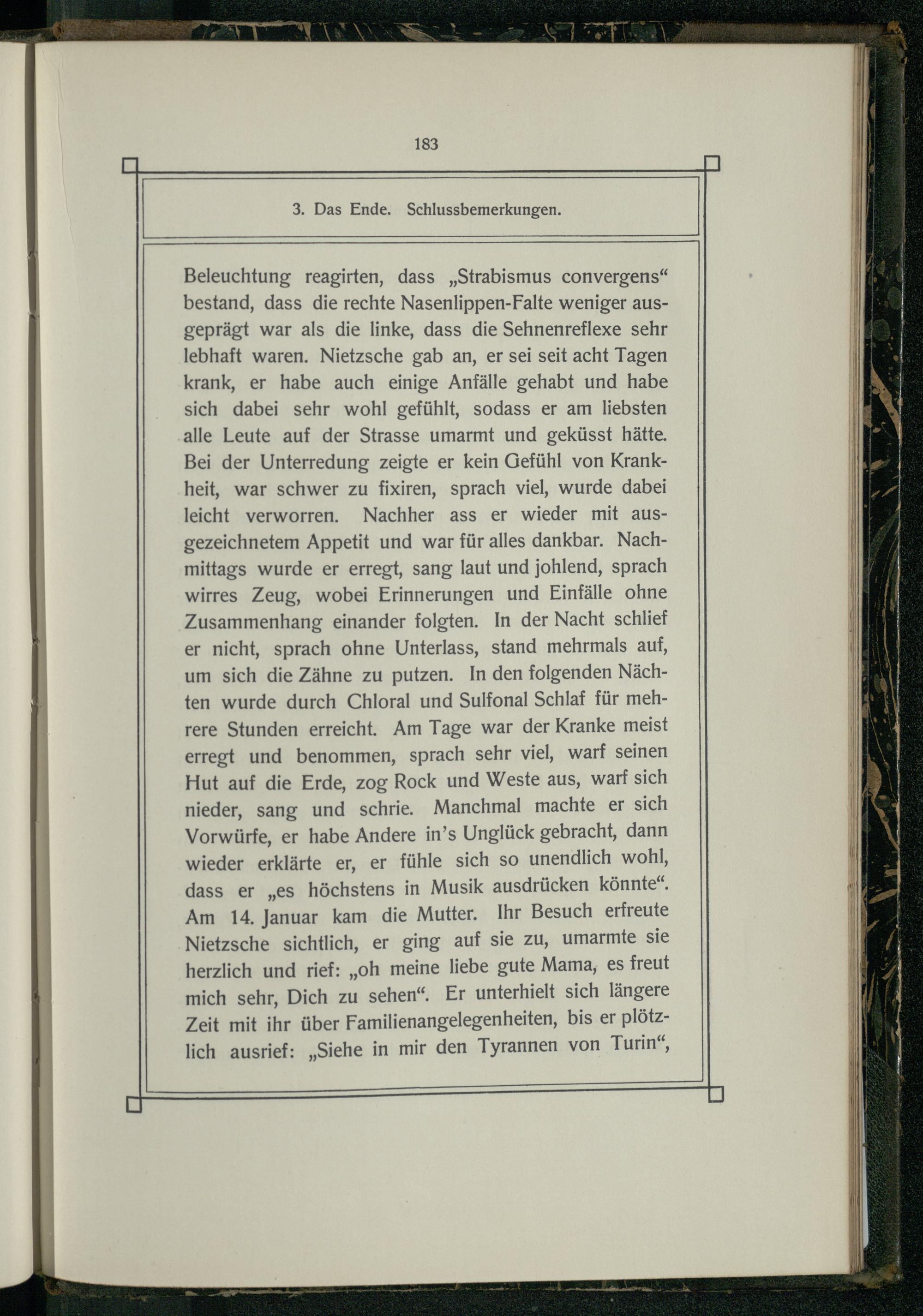 Beleuchtung reagirten, dass„Strabismus convergens“ bestand, dass die rechte Nasenlippen-Falte weniger ausgeprägt war als die linke, dass die Sehnenreflexe sehr lebhaft waren. Nietzsche gab an, er sei seit acht Tagen krank, er habe auch einige Anfälle gehabt und habe sich dabei sehr wohl gefühlt, sodass er am liebsten alle Leute auf der Strasse umarmt und geküsst hätte. Bei der Unterredung zeigte er kein Gefühl von Krankheit, war schwer zu fixiren, sprach viel, wurde dabei leicht verworren. Nachher ass er wieder mit ausgezeichnetem Appetit und war für alles dankbar. Nachmittags wurde er erregt, sang laut und johlend, sprach wirres Zeug, wobei Erinnerungen und Einfälle ohne Zusammenhang einander folgten. In der Nacht schlief er nicht, sprach ohne Unterlass, stand mehrmals auf, um sich die Zähne zu putzen. In den folgenden Nächten wurde durch Chloral und Sulfonal Schlaf für mehrere Stunden erreicht. Am Tage war der Kranke meist erregt und benommen, sprach sehr viel, warf seinen Hut auf die Erde, zog Rock und Weste aus, warf sich nieder, sang und schrie. Manchmal machte er sich Vorwürfe, er habe Andere in’s Unglück gebracht, dann wieder erklärte er, er fühle sich so unendlich wohl, dass er„es höchstens in Musik ausdrücken könnte“. Am 14. Januar kam die Mutter. Ihr Besuch erfreute Nietzsche sichtlich, er ging auf sie zu, umarmte sie herzlich und rief:„oh meine liebe gute Mama, es freut mich sehr, Dich zu sehen“. Er unterhielt sich längere Zeit mit ihr über Familienangelegenheiten, bis er plötzlich ausrief:„Siehe in mir den Tyrannen von Turin“,