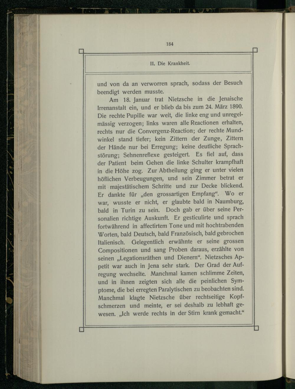 Am 18. Januar trat Nietzsche in die Jenaische Irrenanstalt ein, und er blieb da bis zum 24. März 1890. Die rechte Pupille war weit, die linke eng und unregelmässig verzogen; links waren alle Reactionen erhalten, rechts nur die Convergenz-Reaction; der rechte Mundwinkel stand tiefer; kein Zittern der Zunge, Zittern der Hände nur bei Erregung; keine deutliche Sprachstörung; Sehnenreflexe gesteigert. Es fiel auf, dass der Patient beim Gehen die linke Schulter krampfhaft in die Höhe zog. Zur Abtheilung ging er unter vielen höflichen Verbeugungen, und sein Zimmer betrat er mit majestätischem Schritte und zur Decke blickend. Er dankte für„den grossartigen Empfang“. Wo er war, wusste er nicht, er glaubte bald in Naumburg, bald in Turin zu sein. Doch gab er über seine Personalien richtige Auskunft. Er gesticulirte und sprach fortwährend in affectirtem Tone und mit hochtrabenden Worten, bald Deutsch, bald Französisch, bald gebrochen Italienisch. Gelegentlich erwähnte er seine grossen Compositionen und sang Proben daraus, erzählte von seinen„Legationsräthen und Dienern“. Nietzsches Appetit war auch in Jena sehr stark. Der Grad der Aufregung wechselte. Manchmal kamen schlimme Zeiten, und in ihnen zeigten sich alle die peinlichen Symptome, die bei erregten Paralytischen zu beobachten sind. Manchmal klagte Nietzsche über rechtseitige Kopfschmerzen und meinte, er sei deshalb zu lebhaft gewesen.„Ich werde rechts in der Stirn krank gemacht.“