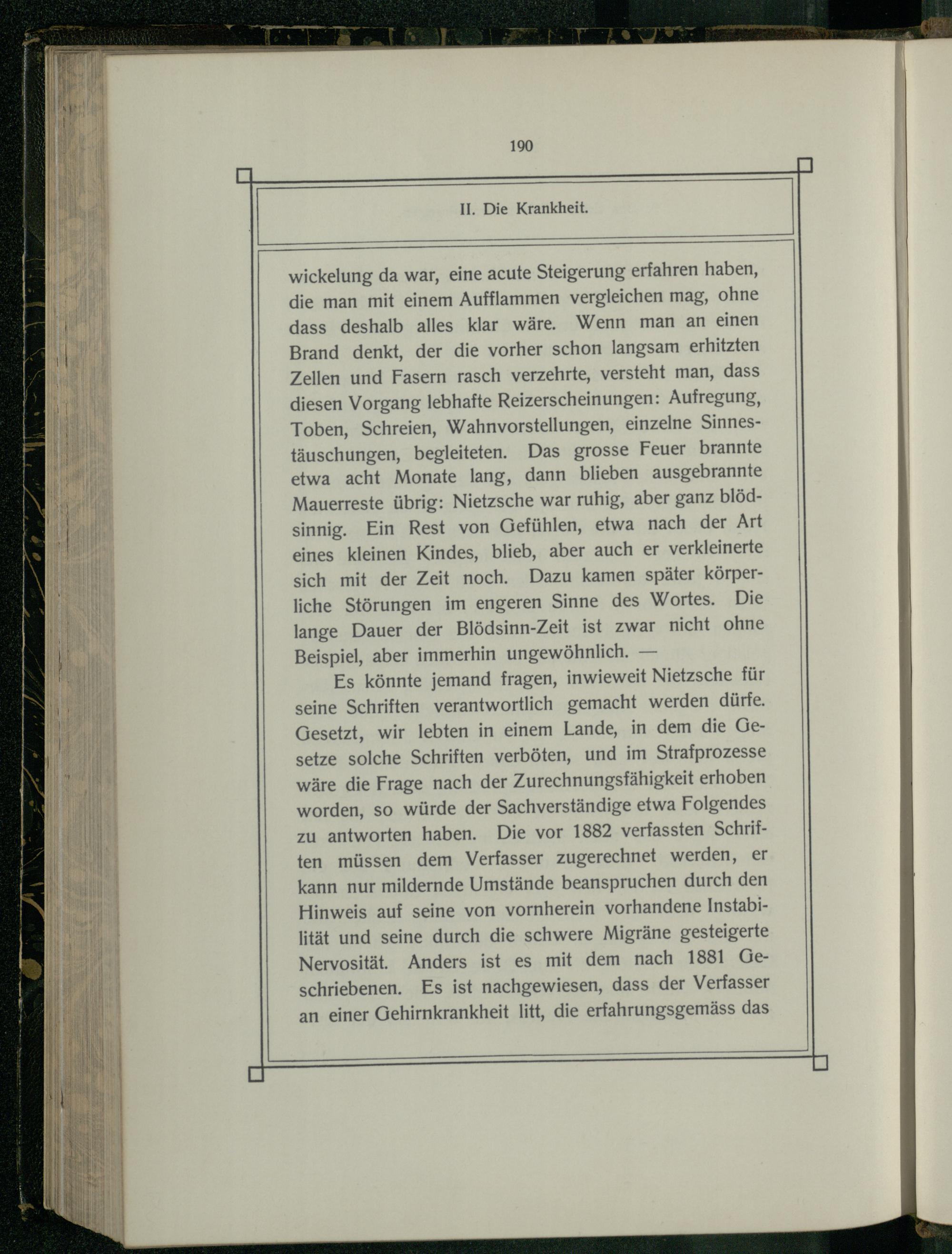 Es könnte jemand fragen, inwieweit Nietzsche für seine Schriften verantwortlich gemacht werden dürfe. Gesetzt, wir lebten in einem Lande, in dem die Gesetze solche Schriften verböten, und im Strafprozesse wäre die Frage nach der Zurechnungsfähigkeit erhoben worden, so würde der Sachverständige etwa Folgendes zu antworten haben. Die vor 1882 verfassten Schriften müssen dem Verfasser zugerechnet werden, er kann nur mildernde Umstände beanspruchen durch den Hinweis auf seine von vornherein vorhandene Instabilität und seine durch die schwere Migräne gesteigerte Nervosität. Anders ist es mit dem nach 1881 Geschriebenen. Es ist nachgewiesen, dass der Verfasser an einer Gehirnkrankheit litt, die erfahrungsgemäss das