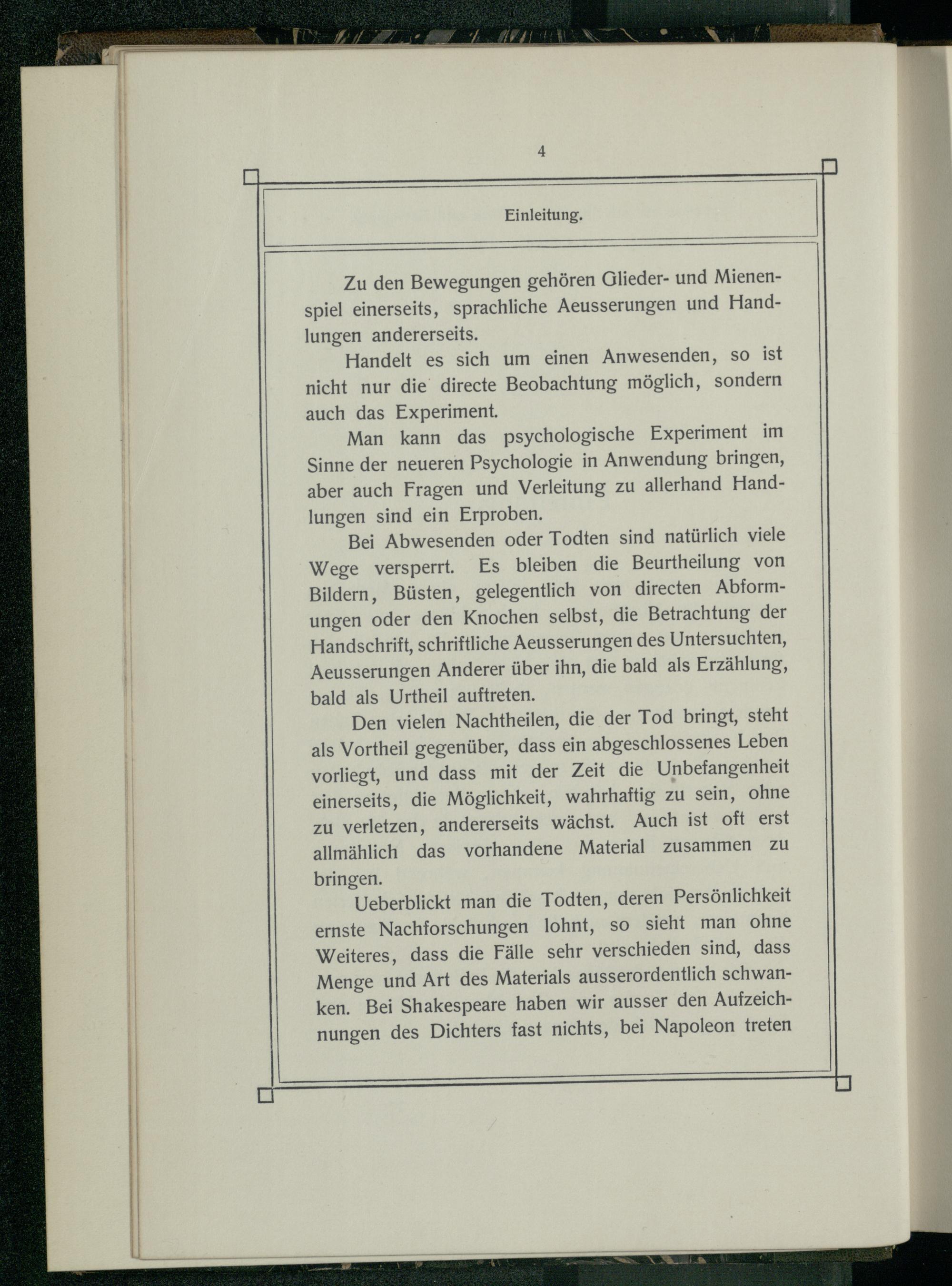 Bei Abwesenden oder Todten sind natürlich viele Wege versperrt. Es bleiben die Beurtheilung von Bildern, Büsten, gelegentlich von directen Abformungen oder den Knochen selbst, die Betrachtung der Handschrift, schriftliche Aeusserungen des Untersuchten, Aeusserungen Anderer über ihn, die bald als Erzählung, bald als Urtheil auftreten.