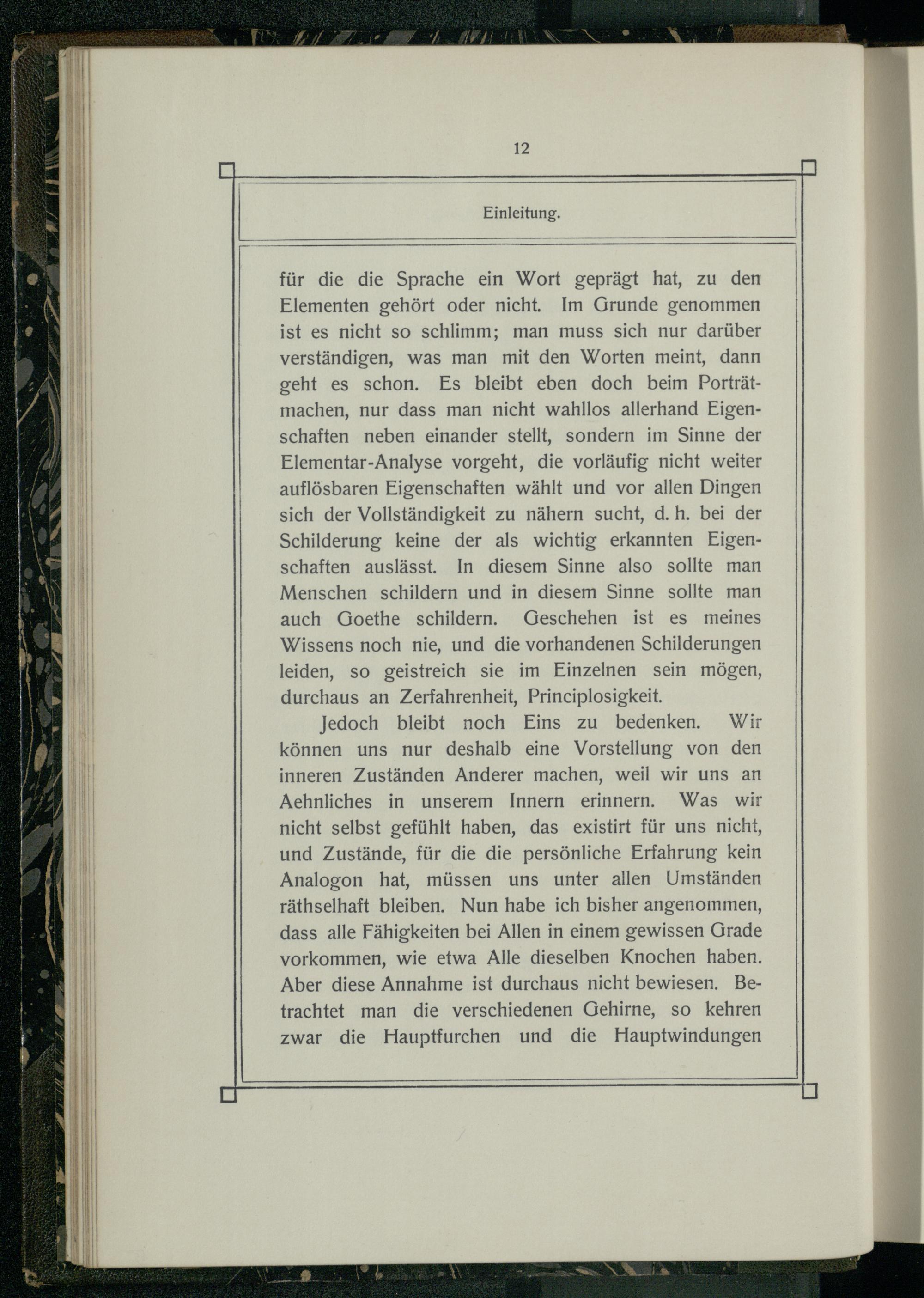 für die die Sprache ein Wort geprägt hat, zu den Elementen gehört oder nicht. Im Grunde genommen ist es nicht so schlimm; man muss sich nur darüber verständigen, was man mit den Worten meint, dann geht es schon. Es bleibt eben doch beim Porträtmachen, nur dass man nicht wahllos allerhand Eigenschaften neben einander stellt, sondern im Sinne der Elementar-Analyse vorgeht, die vorläufig nicht weiter auflösbaren Eigenschaften wählt und vor allen Dingen sich der Vollständigkeit zu nähern sucht, d.h. bei der Schilderung keine der als wichtig erkannten Eigenschaften auslässt. In diesem Sinne also sollte man Menschen schildern und in diesem Sinne sollte man auch Goethe schildern. Geschehen ist es meines Wissens noch nie, und die vorhandenen Schilderungen leiden, so geistreich sie im Einzelnen sein mögen, durchaus an Zerfahrenheit, Principlosigkeit.