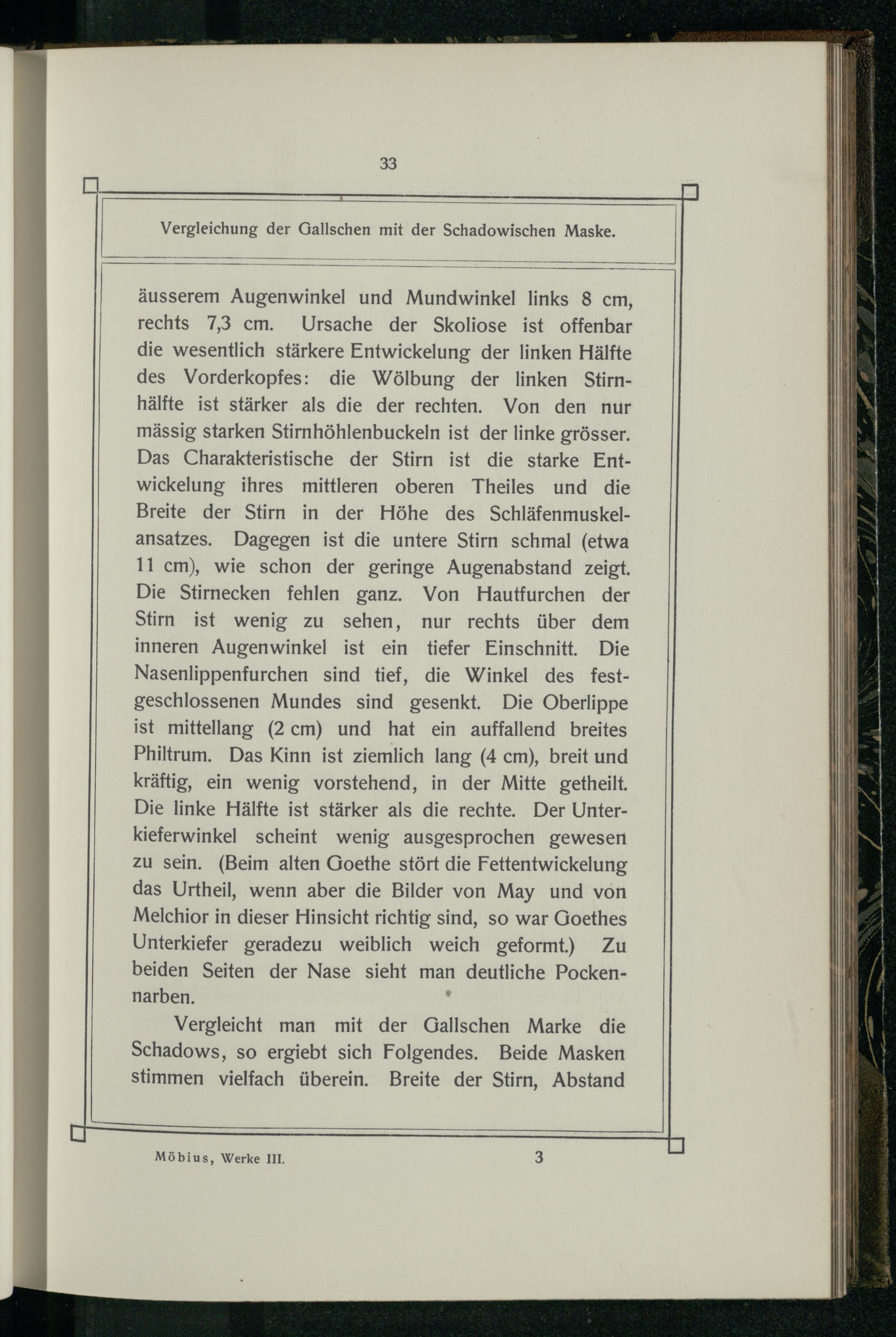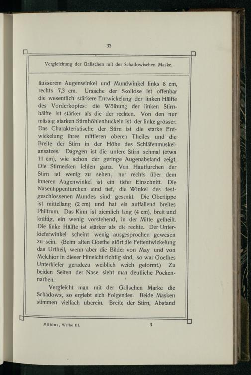 äusserem Augenwinkel und Mundwinkel links 8 cm, rechts 7,3 cm. Ursache der Skoliose ist offenbar die wesentlich stärkere Entwickelung der linken Hälfte des Vorderkopfes: die Wölbung der linken Stirnhälfte ist stärker als die der rechten. Von den nur mässig starken Stirnhöhlenbuckeln ist der linke grösser. Das Charakteristische der Stirn ist die starke Entwickelung ihres mittleren oberen Theiles und die Breite der Stirn in der Höhe des Schläfenmuskelansatzes. Dagegen ist die untere Stirn schmal(etwa 11 cm), wie schon der geringe Augenabstand zeigt. Die Stirnecken fehlen ganz. Von Hautfurchen der Stimm ist wenig zu sehen, nur rechts über dem inneren Augenwinkel ist ein tiefer Einschnitt. Die Nasenlippenfurchen sind tief, die Winkel des festgeschlossenen Mundes sind gesenkt. Die Oberlippe ist mittellang(2 cm) und hat ein auffallend breites Philtrum. Das Kinn ist ziemlich lang(4 cm), breit und kräftig, ein wenig vorstehend, in der Mitte getheilt. Die linke Hälfte ist stärker als die rechte. Der Unterkieferwinkel scheint wenig ausgesprochen gewesen zu sein.(Beim alten Goethe stört die Fettentwickelung das Urtheil, wenn aber die Bilder von May und von Melchior in dieser Hinsicht richtig sind, so war Goethes Unterkiefer geradezu weiblich weich geformt.) Zu beiden Seiten der Nase sieht man deutliche Pockennarben.'