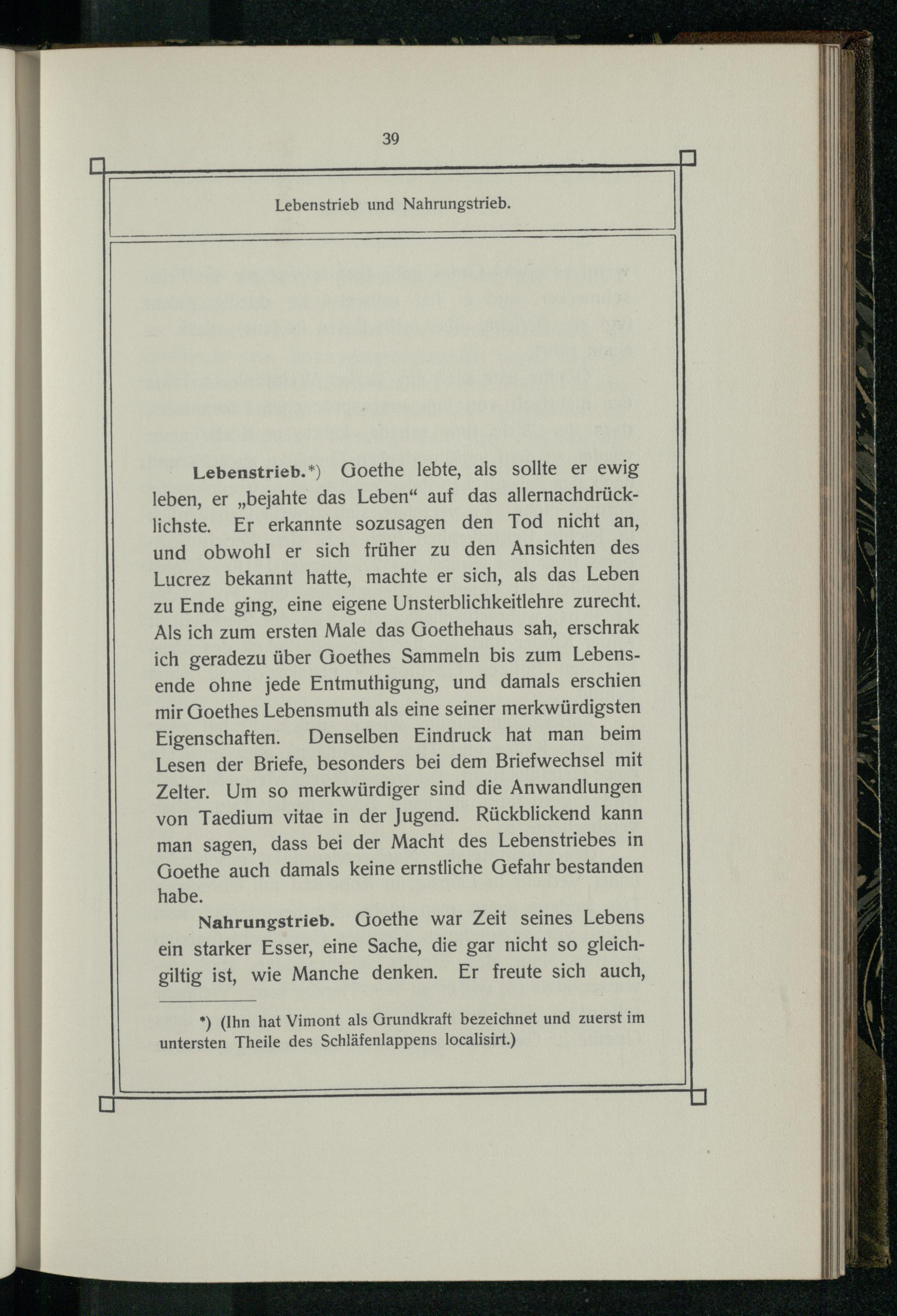 Lebenstrieb.*) Goethe lebte, als sollte er ewig leben, er„bejahte das Leben“ auf das allernachdrücklichste. Er erkannte sozusagen den Tod nicht an, und obwohl er sich früher zu den Ansichten des Lucrez bekannt hatte, machte er sich, als das Leben zu Ende ging, eine eigene Unsterblichkeitlehre zurecht. Als ich zum ersten Male das Goethehaus sah, erschrak ich geradezu über Goethes Sammeln bis zum Lebensende ohne jede Entmuthigung, und damals erschien mir Goethes Lebensmuth als eine seiner merkwürdigsten Eigenschaften. Denselben Eindruck hat man beim Lesen der Briefe, besonders bei dem Briefwechsel mit Zelter. Um so merkwürdiger sind die Anwandlungen von Taedium vitae in der Jugend. Rückblickend kann man sagen, dass bei der Macht des Lebenstriebes in Goethe auch damals keine ernstliche Gefahr bestanden habe.