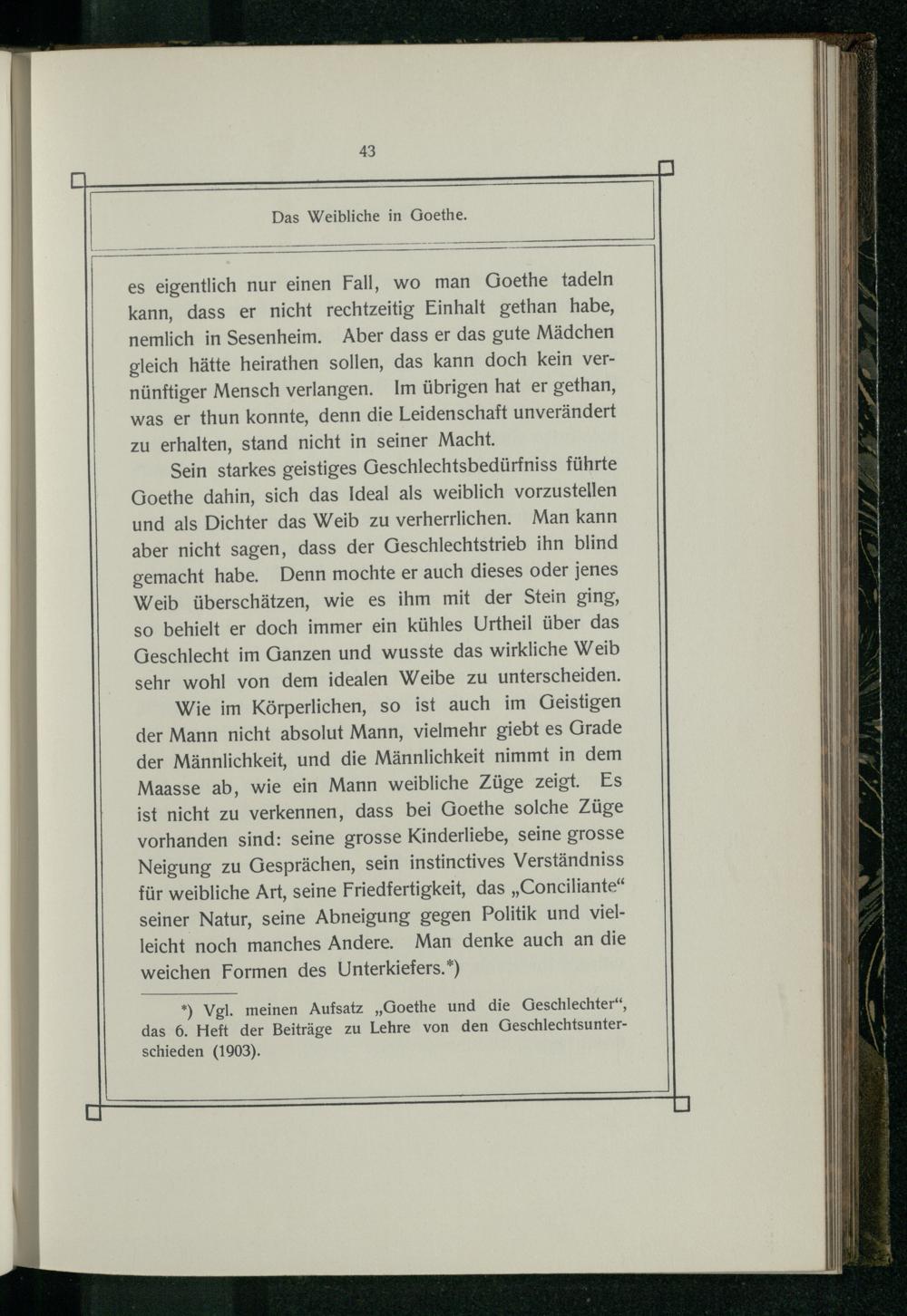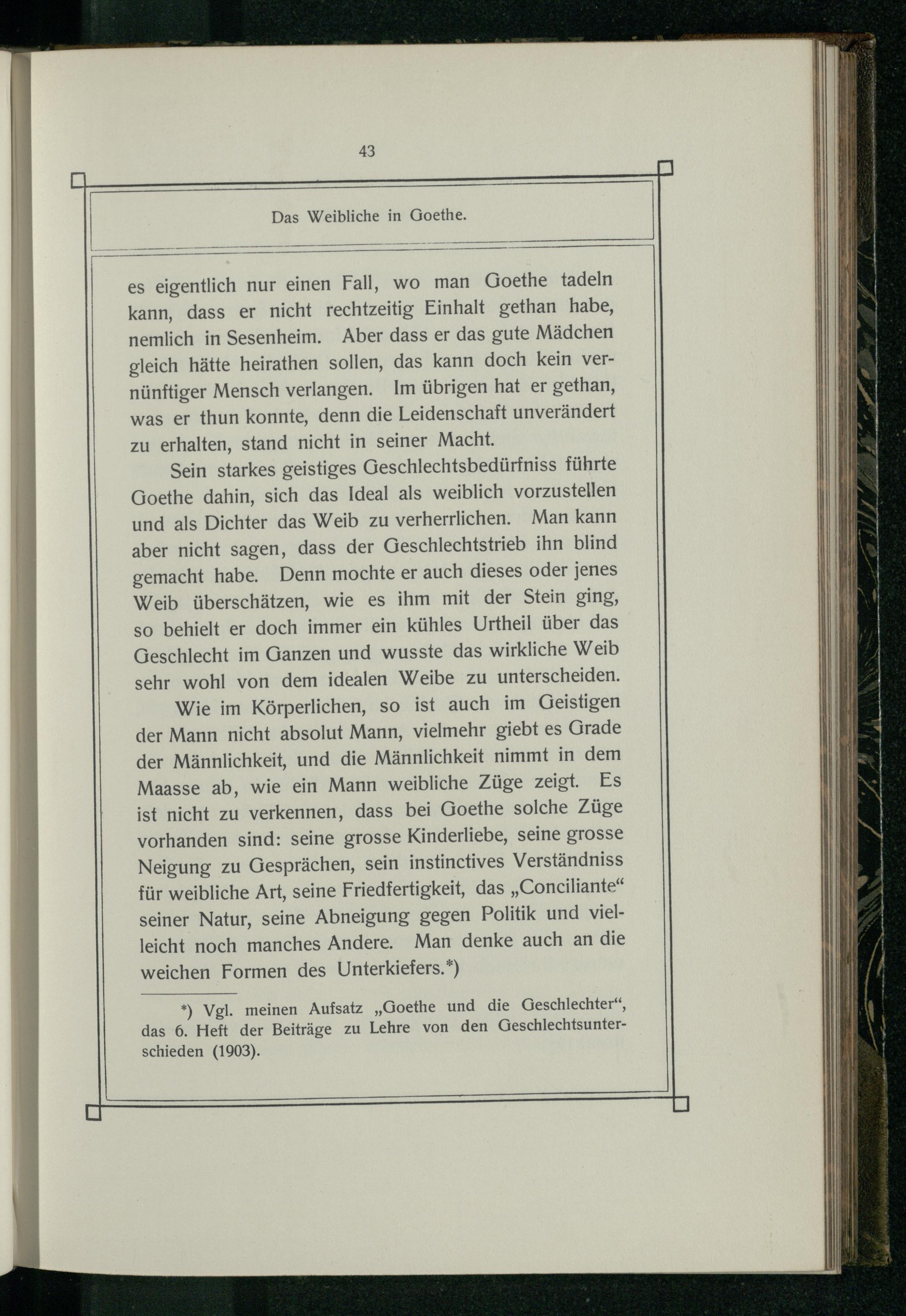 Wie im Körperlichen, so ist auch im Geistigen der Mann nicht absolut Mann, vielmehr giebt es Grade der Männlichkeit, und die Männlichkeit nimmt in dem Maasse ab, wie ein Mann weibliche Züge zeigt. Es ist nicht zu verkennen, dass bei Goethe solche Züge vorhanden sind: seine grosse Kinderliebe, seine grosse Neigung zu Gesprächen, sein instinctives Verständniss für weibliche Art, seine Friedfertigkeit, das„Coneciliante“ seiner Natur, seine Abneigung gegen Politik und vielleicht noch manches Andere. Man denke auch an die weichen Formen des Unterkiefers.”)