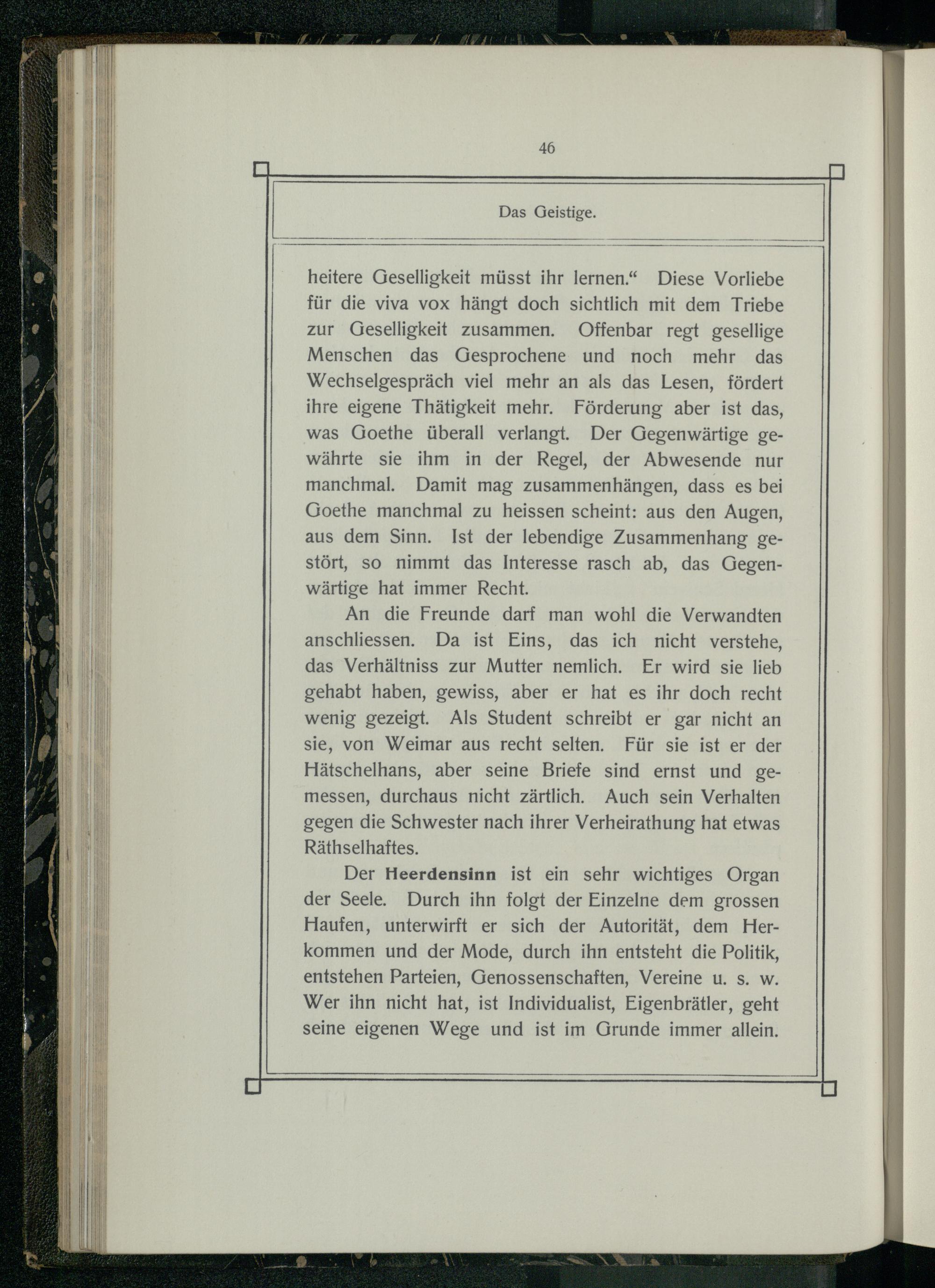 heitere Geselligkeit müsst ihr lernen.“ Diese Vorliebe für die viva vox hängt doch sichtlich mit dem Triebe zur Geselligkeit zusammen. Offenbar regt gesellige Menschen das Gesprochene und noch mehr das Wechselgespräch viel mehr an als das Lesen, fördert ihre eigene Thätigkeit mehr. Förderung aber ist das, was Goethe überall verlangt. Der Gegenwärtige gewährte sie ihm in der Regel, der Abwesende nur manchmal. Damit mag zusammenhängen, dass es bei Goethe manchmal zu heissen scheint: aus den Augen, aus dem Sinn. Ist der lebendige Zusammenhang ge- 1 stört, so nimmt das Interesse rasch ab, das Gegen-| wärtige hat immer Recht.|||