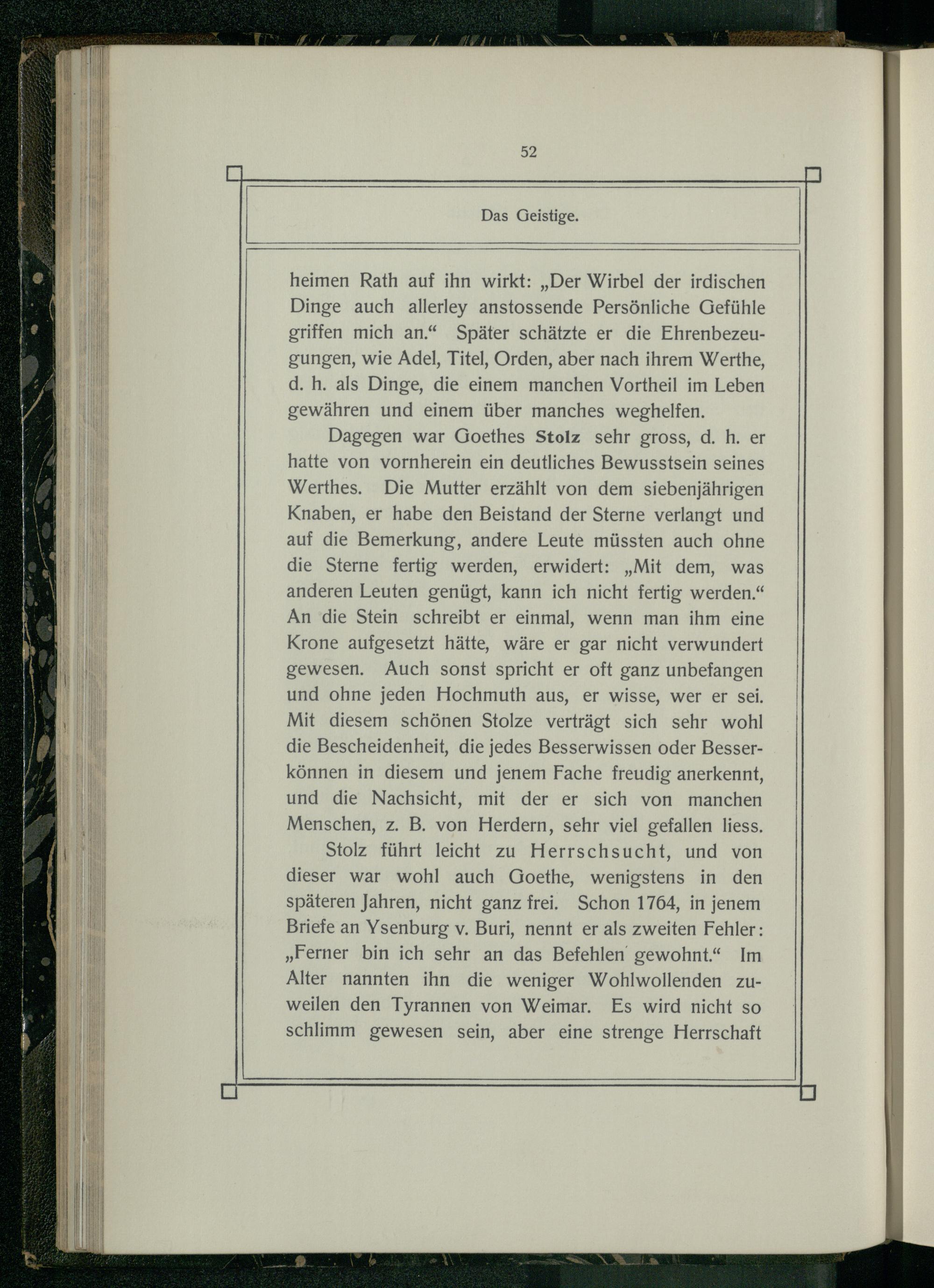 heimen Rath auf ihn wirkt:„Der Wirbel der irdischen Dinge auch allerley anstossende Persönliche Gefühle griffen mich an.“ Später schätzte er die Ehrenbezeugungen, wie Adel, Titel, Orden, aber nach ihrem Werthe, d. h. als Dinge, die einem manchen Vortheil im Leben gewähren und einem über manches weghelfen. Dagegen war Goethes Stolz sehr gross, d. h. er hatte von vornherein ein deutliches Bewusstsein seines Werthes. Die Mutter erzählt von dem siebenjährigen Knaben, er habe den Beistand der Sterne verlangt und auf die Bemerkung, andere Leute müssten auch ohne die Sterne fertig werden, erwidert:„Mit dem, was anderen Leuten genügt, kann ich nicht fertig werden.“ An die Stein schreibt er einmal, wenn man ihm eine Krone aufgesetzt hätte, wäre er gar nicht verwundert gewesen. Auch sonst spricht er oft ganz unbefangen und ohne jeden Hochmuth aus, er wisse, wer er sei. Mit diesem schönen Stolze verträgt sich sehr wohl die Bescheidenheit, die jedes Besserwissen oder Besserkönnen in diesem und jenem Fache freudig anerkennt, und die Nachsicht, mit der er sich von manchen Menschen, z. B. von Herdern, sehr viel gefallen liess. Stolz führt leicht zu Herrschsucht, und von dieser war wohl auch Goethe, wenigstens in den späteren Jahren, nicht ganz frei. Schon 1764, in jenem Briefe an Ysenburg v. Buri, nennt er als zweiten Fehler: „Ferner bin ich sehr an das Befehlen‘ gewohnt.“ Im Alter nannten ihn die weniger Wohlwollenden zuweilen den Tyrannen von Weimar. Es wird nicht so schlimm gewesen sein, aber eine strenge Herrschaft