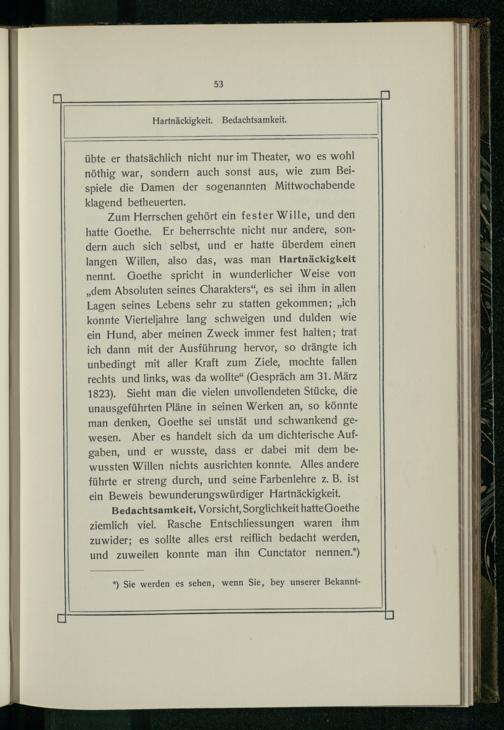 Zum Herrschen gehört ein fester Wille, und den hatte Goethe. Er beherrschte nicht nur andere, sondern auch sich‘ selbst, und er hatte überdem einen langen Willen, also das, was man Hartnäckigkeit nennt. Goethe spricht in wunderlicher Weise von „dem Absoluten seines Charakters“, es sei ihm in allen Lagen seines Lebens sehr zu statten gekommen;„ich konnte Vierteljahre lang schweigen und dulden wie ein Hund, aber meinen Zweck immer fest halten; trat ich dann mit der Ausführung hervor, so drängte ich unbedingt mit aller Kraft zum Ziele, mochte fallen rechts und links, was da wollte“(Gespräch am 31. März 1823). Sieht man die vielen unvollendeten Stücke, die unausgeführten Pläne in seinen Werken an, so könnte man denken, Goethe sei unstät und schwankend gewesen. Aber es handelt sich da um dichterische Aufgaben, und er wusste, dass er dabei mit dem bewussten Willen nichts ausrichten konnte. Alles andere führte er streng durch, und seine Farbenlehre z. B. ist ein Beweis bewunderungswürdiger Hartnäckigkeit.
