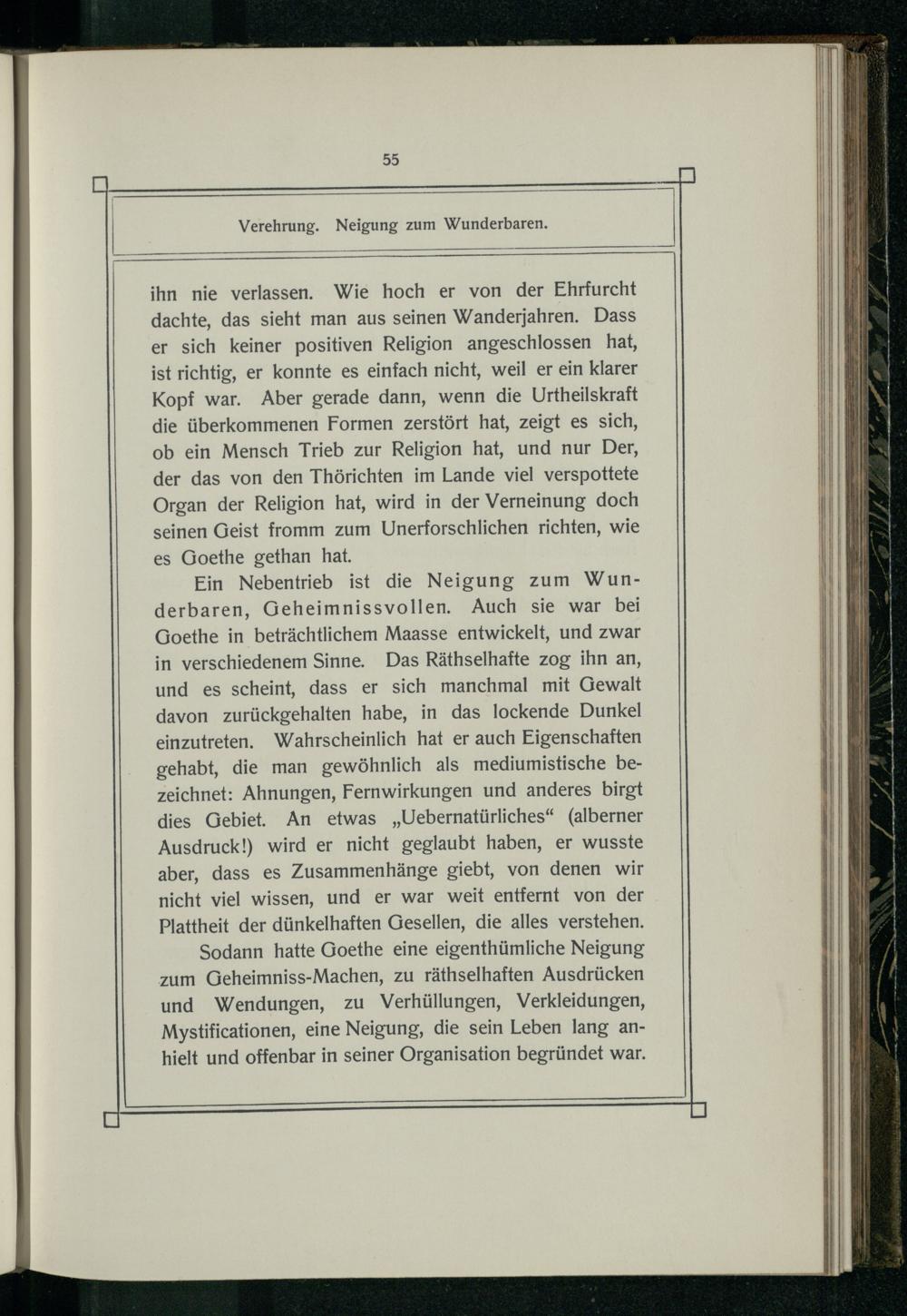 Ein Nebentrieb ist die Neigung zum Wunderbaren, Geheimnissvollen. Auch sie war bei Goethe in beträchtlichem Maasse entwickelt, und zwar in verschiedenem Sinne. Das Räthselhafte zog ihn an, und es scheint, dass er sich manchmal mit Gewalt davon zurückgehalten habe, in das lockende Dunkel einzutreten. Wahrscheinlich hat er auch Eigenschaften gehabt, die man gewöhnlich als mediumistische bezeichnet: Ahnungen, Fernwirkungen und anderes birgt dies Gebiet. An etwas„Uebernatürliches“(alberner Ausdruck!) wird er nicht geglaubt haben, er wusste aber, dass es Zusammenhänge giebt, von denen wir nicht viel wissen, und er war weit entfernt von der Plattheit der dünkelhaften Gesellen, die alles verstehen.