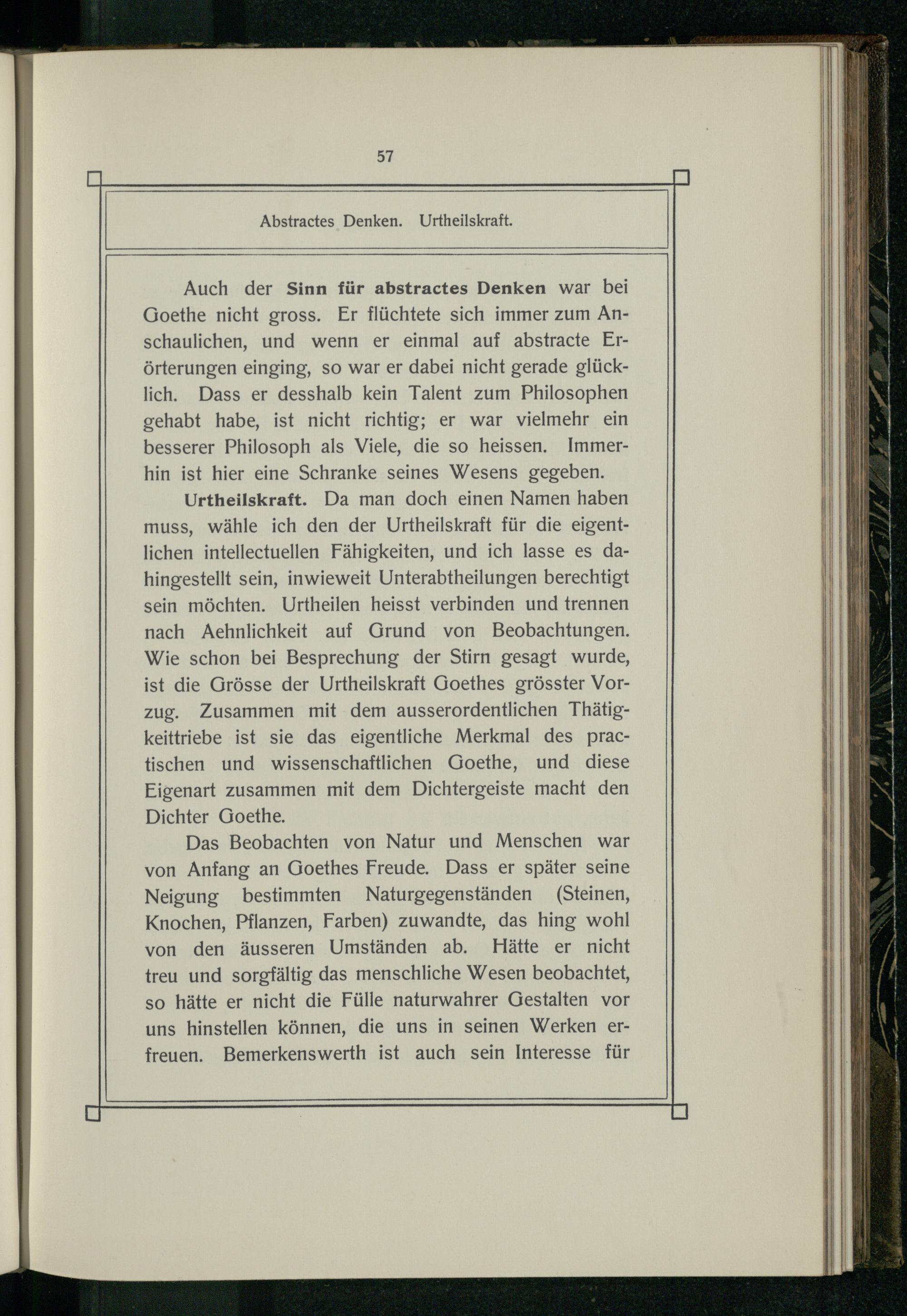 Auch der Sinn für abstractes Denken war bei Goethe nicht gross. Er flüchtete sich immer zum Anschaulichen, und wenn er einmal auf abstracte Erörterungen einging, so war er dabei nicht gerade glücklich. Dass er desshalb kein Talent zum Philosophen gehabt habe, ist nicht richtig; er war vielmehr ein besserer Philosoph als Viele, die so heissen. Immerhin ist hier eine Schranke seines Wesens gegeben.
