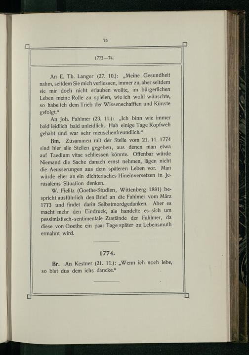 Bm. Zusammen mit der Stelle vom 21. 11. 1774 sind hier alle Stellen gegeben, aus denen man etwa auf Taedium vitae schliessen könnte. Offenbar würde Niemand die Sache danach ernst nehmen, lägen nicht die Aeusserungen aus dem späteren Leben vor. Man würde eher an ein dichterisches Hineinversetzen in Jerusalems Situation denken.