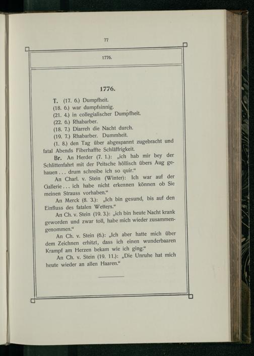 An Ch. v. Stein(6.):„Ich aber hatte mich über dem Zeichnen erhitzt, dass ich einen wunderbaaren Krampf am Herzen bekam wie ich ging.“