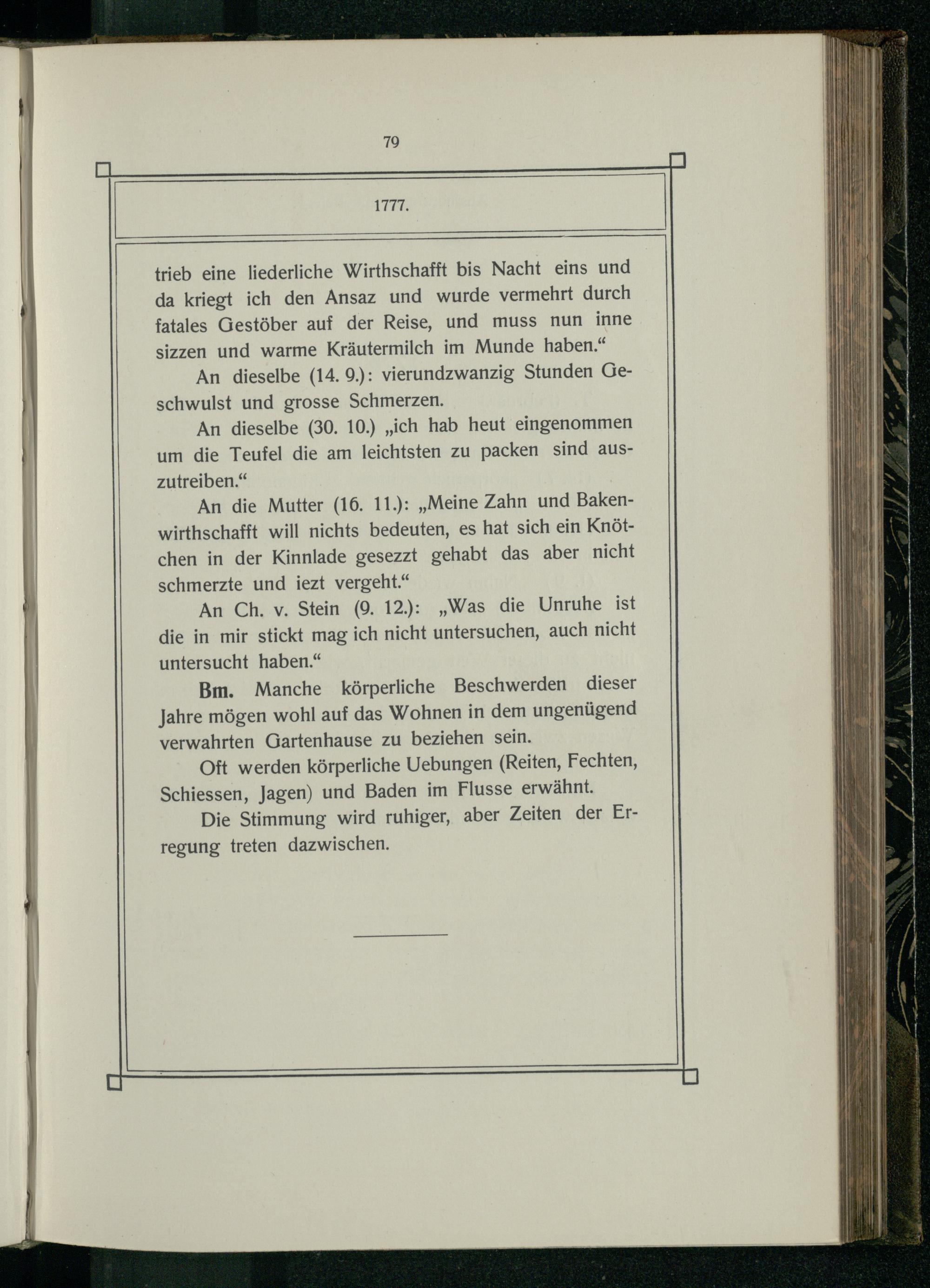 Bm. Manche körperliche Beschwerden dieser Jahre mögen wohl auf das Wohnen in dem ungenügend verwahrten Gartenhause zu beziehen sein.