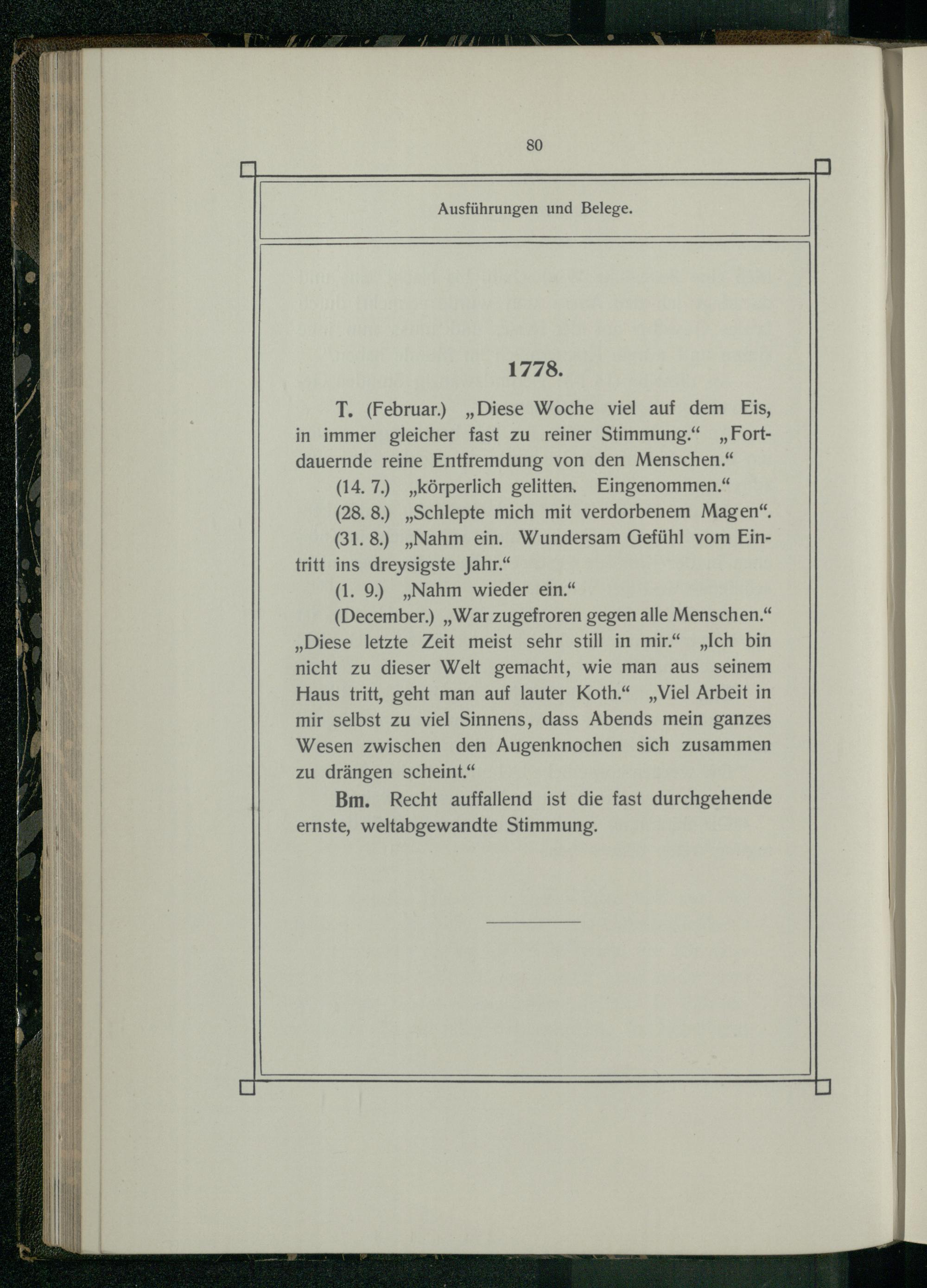 (December.)„War zugefroren gegen alle Menschen.“ „Diese letzte Zeit meist sehr still in mir.“„Ich bin nicht zu dieser Welt gemacht, wie man aus seinem Haus tritt, geht man auf lauter Koth.“„Viel Arbeit in mir selbst zu viel Sinnens, dass Abends mein ganzes Wesen zwischen den Augenknochen sich zusammen zu drängen scheint.“