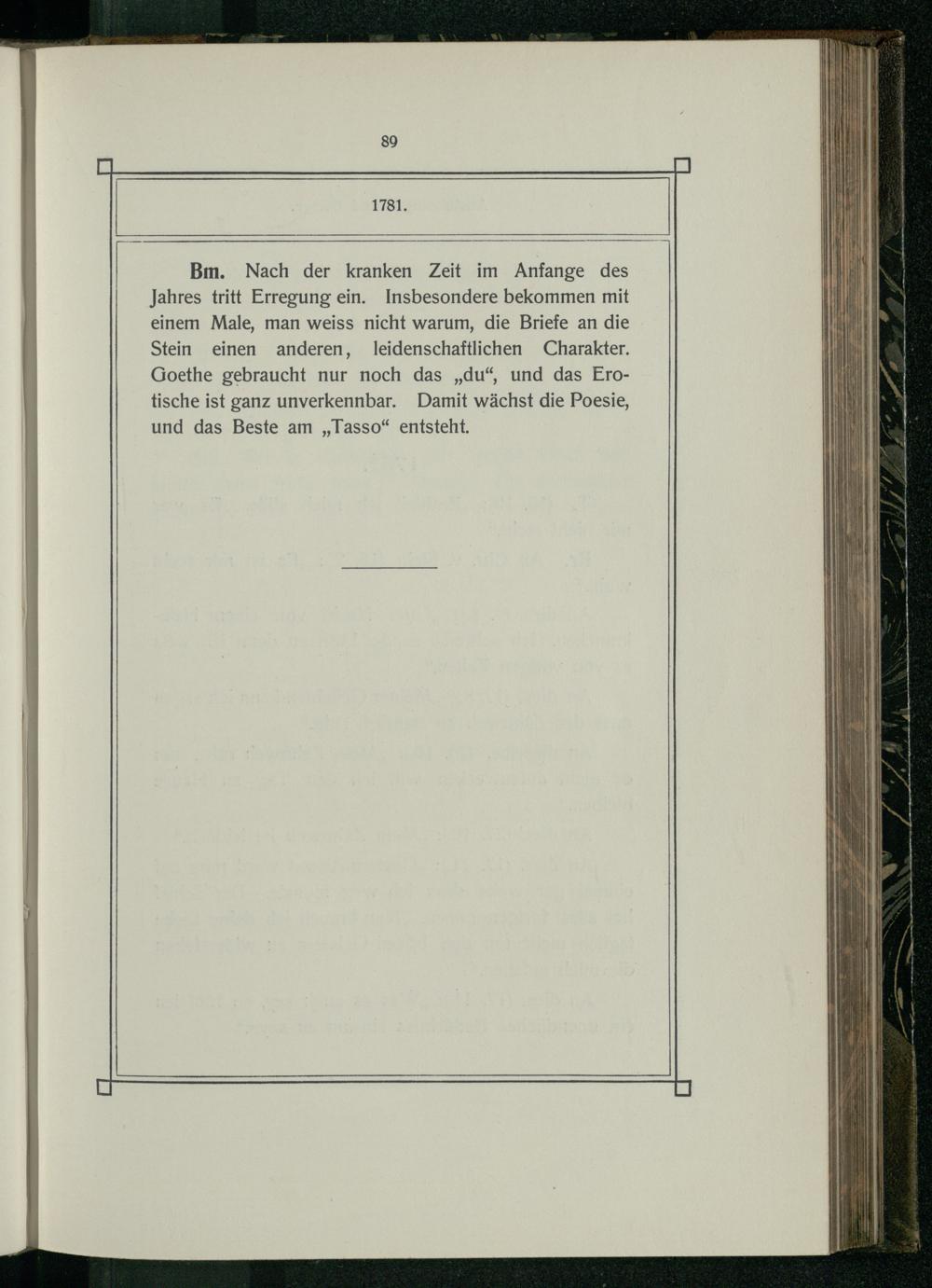 Bm. Nach der kranken Zeit im Anfange des Jahres tritt Erregung ein. Insbesondere bekommen mit einem Male, man weiss nicht warum, die Briefe an die Stein einen anderen, Ileidenschaftlichen Charakter. Goethe gebraucht nur noch das„du“, und das Erotische ist ganz unverkennbar. Damit wächst die Poesie, und das Beste am„Tasso“ entsteht.