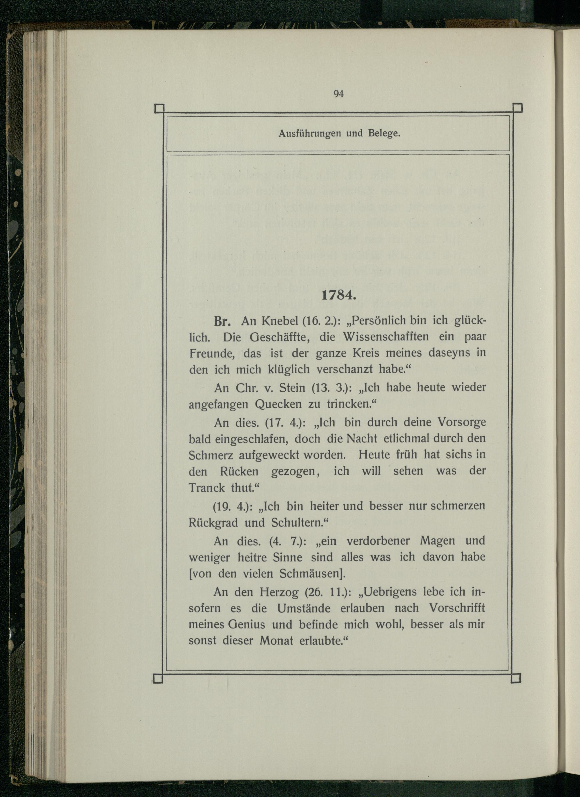Br. An Knebel(16. 2.):„Persönlich bin ich glücklich. Die Geschäffte, die Wissenschafften ein paar Freunde, das ist der ganze Kreis meines daseyns in den ich mich klüglich verschanzt habe.“