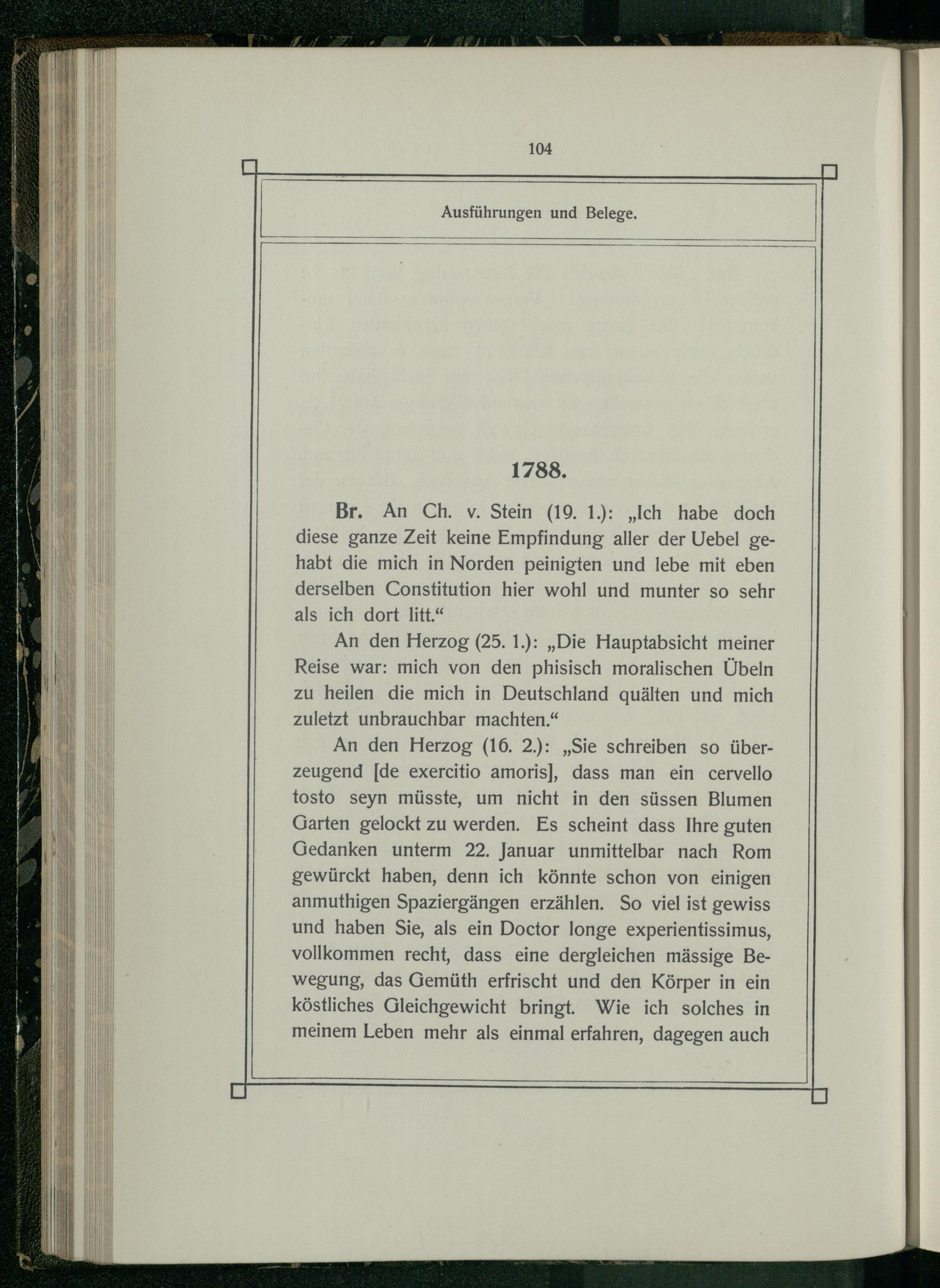Br. An Ch. v. Stein(19. 1.):„Ich habe doch diese ganze Zeit keine Empfindung aller der Uebel gehabt die mich in Norden peinigten und lebe mit eben derselben Constitution hier wohl und munter so sehr als ich dort litt.“