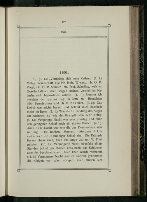 T.(3. 1.):„Vermehrte sich mein Katharr.(4. 1.) Mittag Gesellschaft, als: Hr. Hofr. Wieland, Hr. G. R. Voigt, Hr. H. R. Schiller, Hr. Prof. Schelling, welcher Gesellschaft ich aber, wegen meines vermehrten Katarrhs nicht beywohnen konnte.(5. 1.): Brachte ich meistens den ganzen Tag im Bette zu. Besuchten mich Serenissimus und Hr. H. R. Schiller.(6. 1.): Das Uebel war nicht besser und befand mich desshalb meist im Bette.(7. 1.) War die Entzündung des Auges am höchsten, so wie der Krampfhusten sehr heftig. (8. 1.): Vergangne Nacht war sehr unruhig und ohne den geringsten Schlaf noch ein starker Husten.(9. 1.): Auch diese Nacht war wie die des Donnerstags sehr unruhig. Der höchste Moment. Morgens 8 Uhr stellte sich ein 3 stündiger Schlaf ein. Die Krämpfe liessen etwas nach, auch das Auge war um*/, Theil gefallen.(10. 1.): Vergangene Nacht ebenfalls einige Stunden Schlaf, der Husten liess nach, das Schlucken aber fiel beschwerlicher. Aller Thee wurde verbannt. (11. 1.) Vergangene Nacht war im Ganzen genommen die ruhigste von. allen vorigen, auch fanden sich
