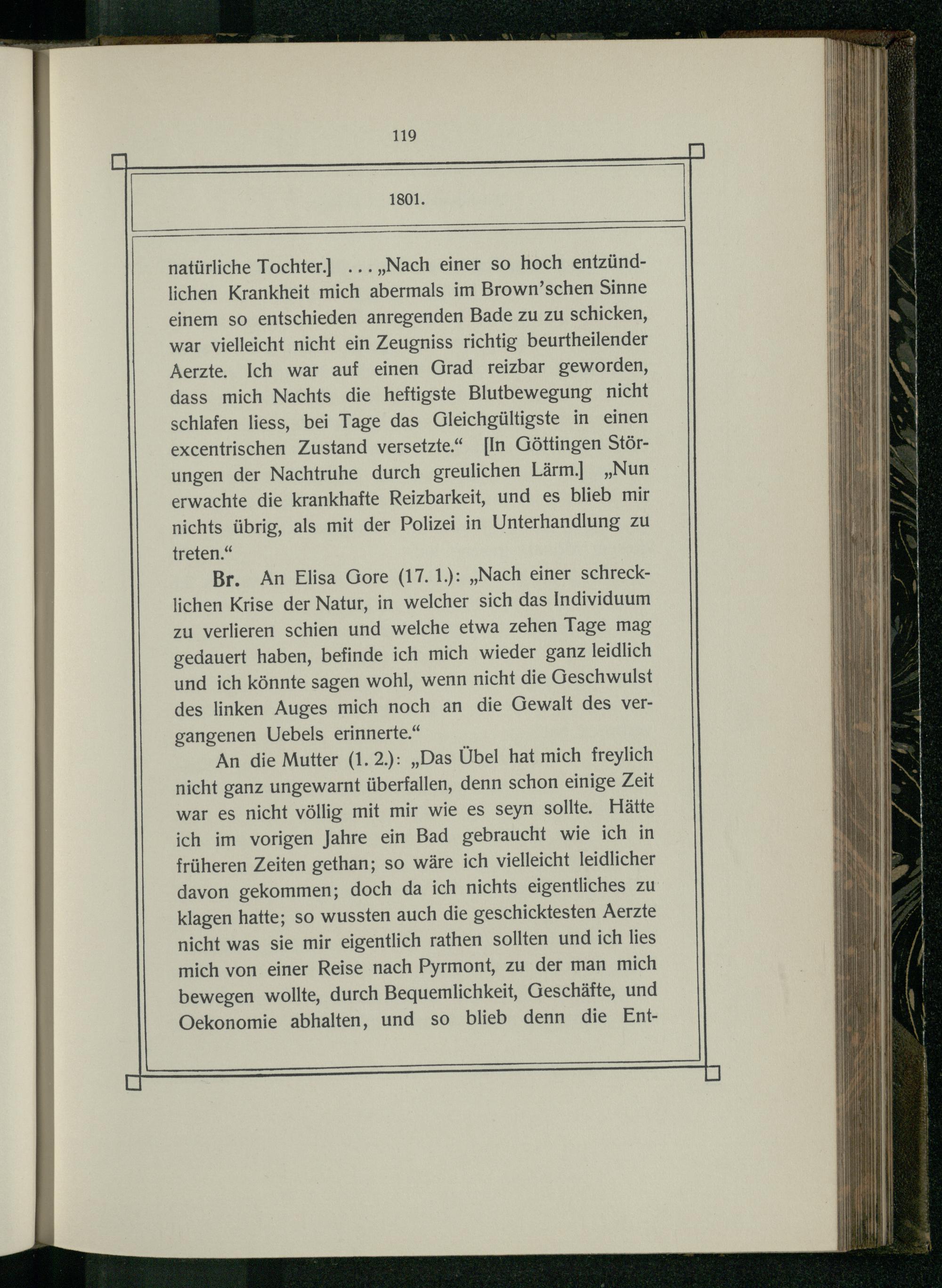 natürliche Tochter.]...„Nach einer so hoch entzündlichen Krankheit mich abermals im Brown’schen Sinne einem so entschieden anregenden Bade zu zu schicken, war vielleicht nicht ein Zeugniss richtig beurtheilender Aerzte. Ich war auf einen Grad reizbar geworden, dass mich Nachts die heftigste Blutbewegung nicht schlafen liess, bei Tage das Gleichgültigste in einen excentrischen Zustand versetzte.“[In Göttingen Störungen der Nachtruhe durch greulichen Lärm.]„Nun erwachte die krankhafte Reizbarkeit, und es blieb mir nichts übrig, als mit der Polizei in Unterhandlung zu treten.“