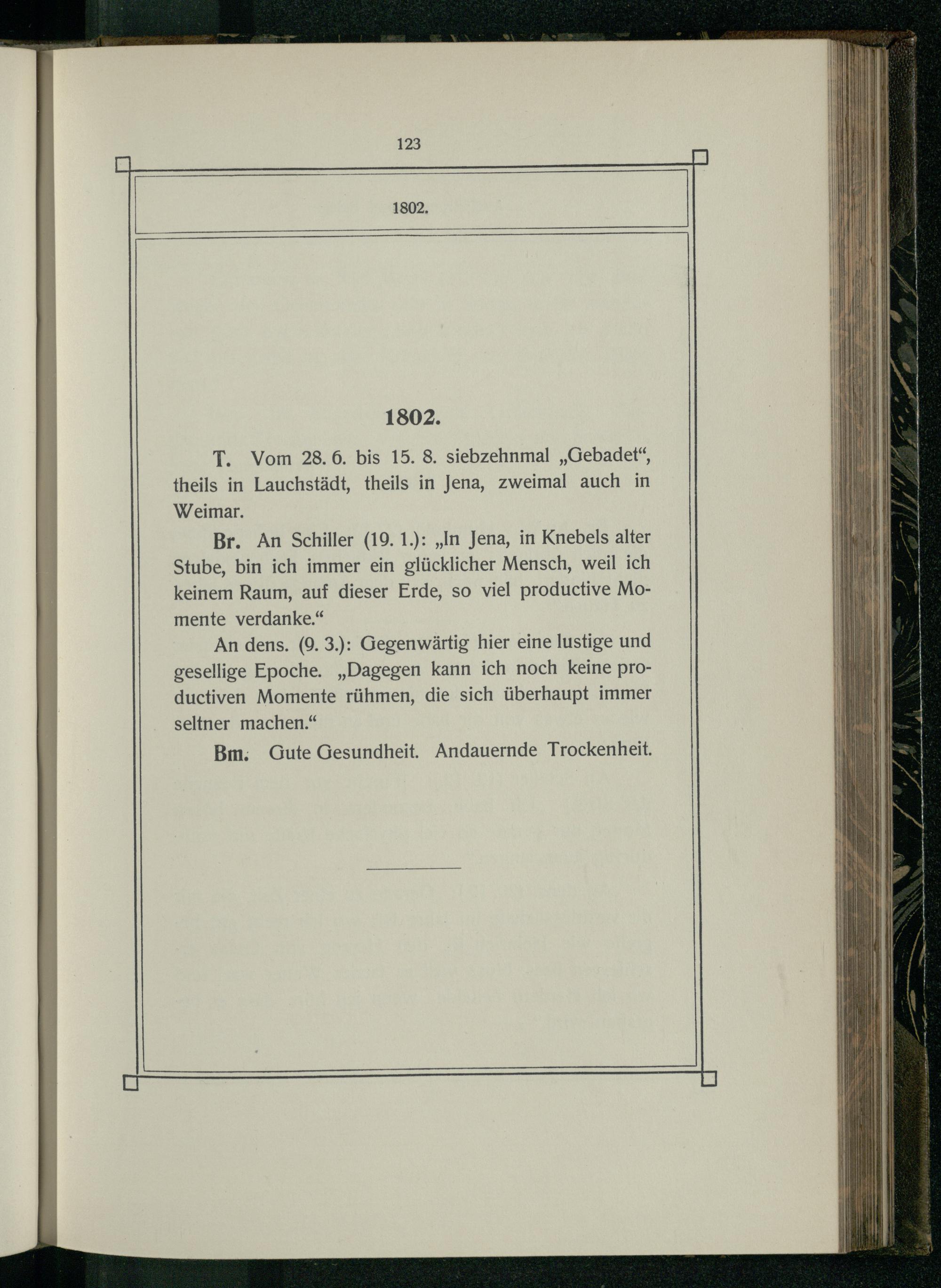 T. Vom 28.6. bis 15. 8. siebzehnmal„Gebadet“, theils in Lauchstädt, theils in Jena, zweimal auch in Weimar.