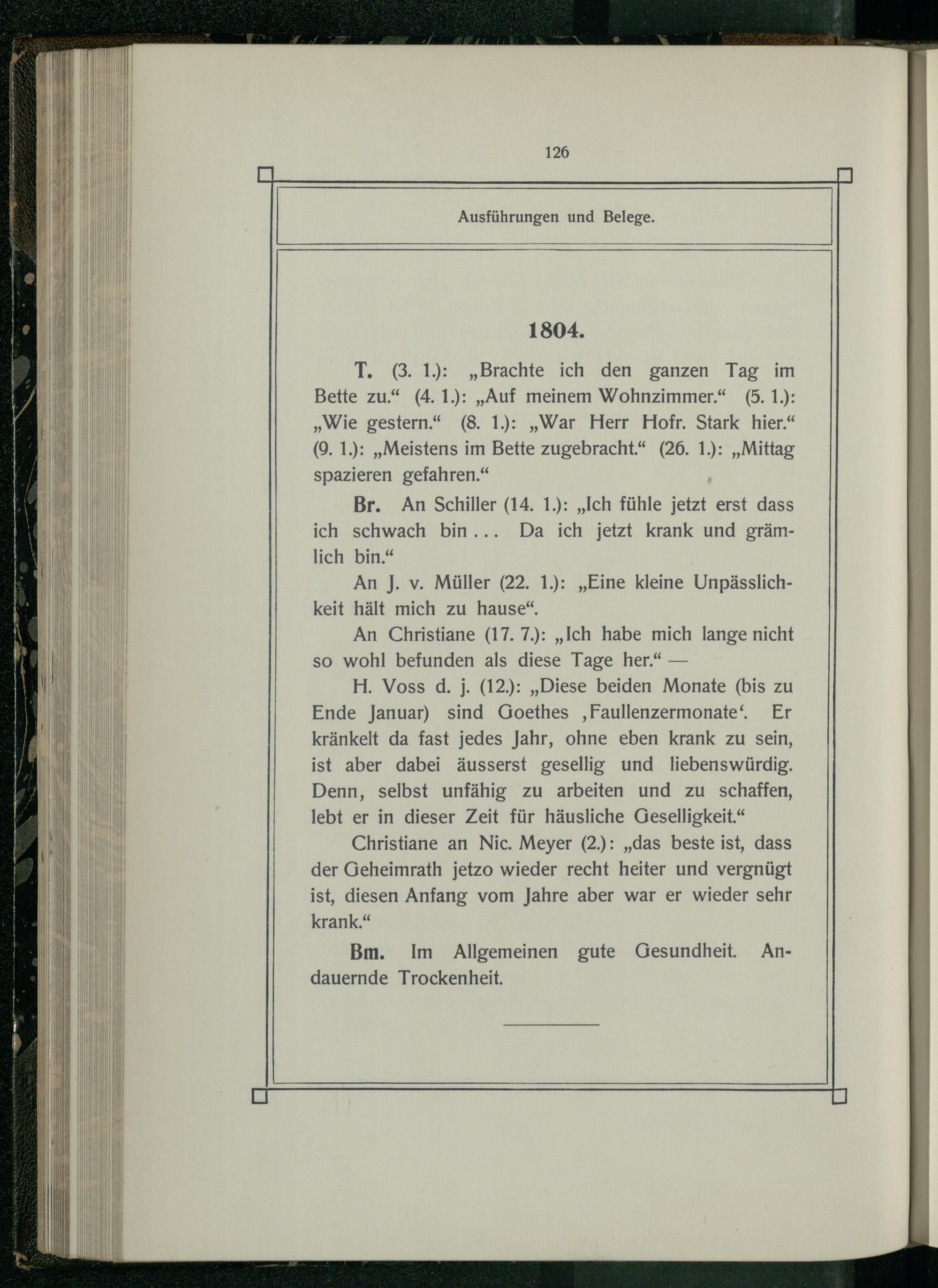 T., 6 1):„Brachte ich den ganzen Tag im Bette zu.“(4. 1.):„Auf meinem Wohnzimmer.“(5. 1.): „Wie gestern.“(8 1.):„War Herr Hofr. Stark hier.“ (9. 1.):„Meistens im Bette zugebracht.“(26. 1.):„Mittag spazieren gefahren.“