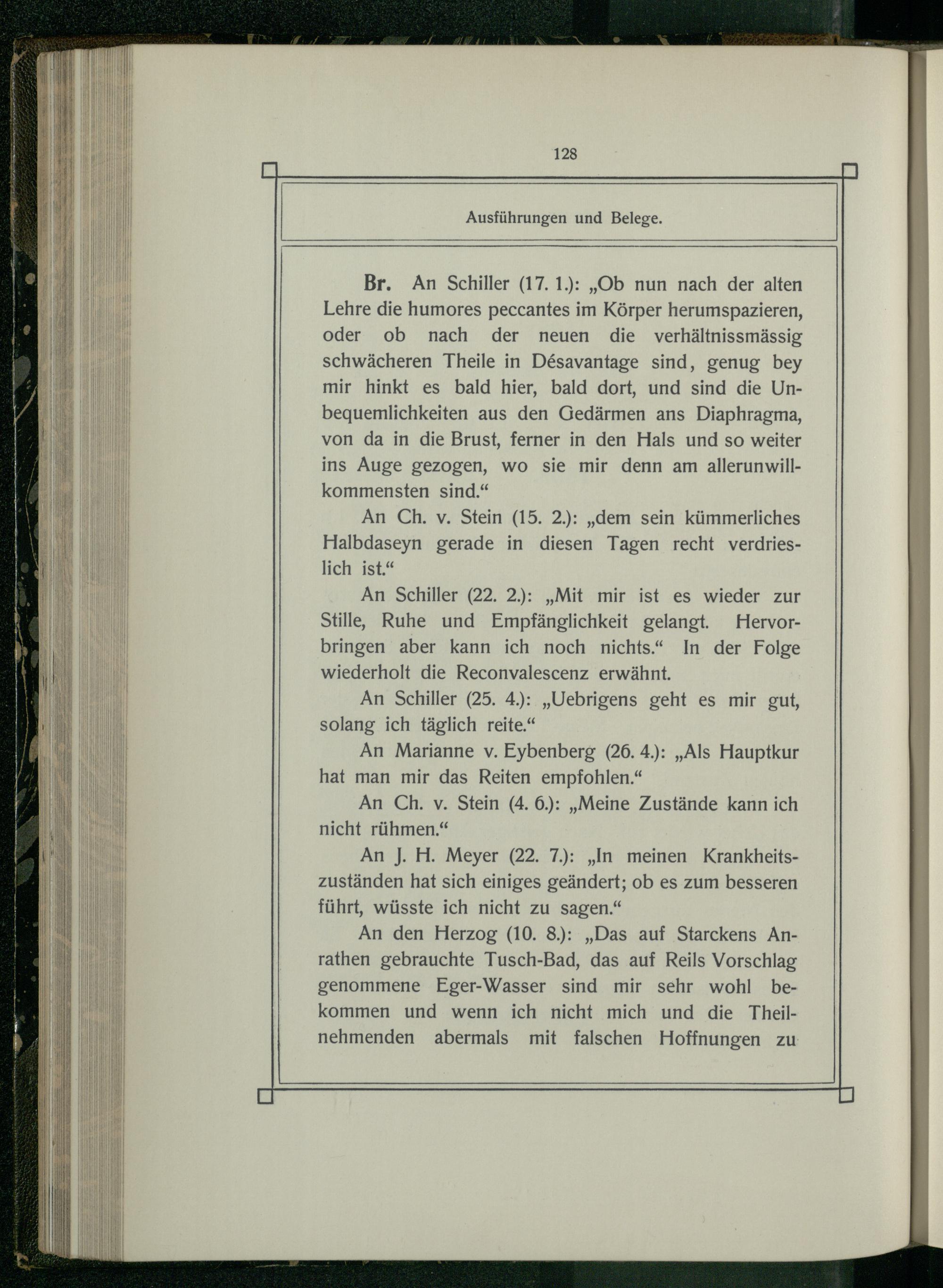 Br. An Schiller(17. 1.):„Ob nun nach der alten Lehre die humores peccantes im Körper herumspazieren, oder ob nach der neuen die verhältnissmässig schwächeren Theile in Desavantage sind, genug bey mir hinkt es bald hier, bald dort, und sind die Unbequemlichkeiten aus den Gedärmen ans Diaphragma, von da in die Brust, ferner in den Hals und so weiter ins Auge gezogen, wo sie mir denn am allerunwillkommensten sind.“