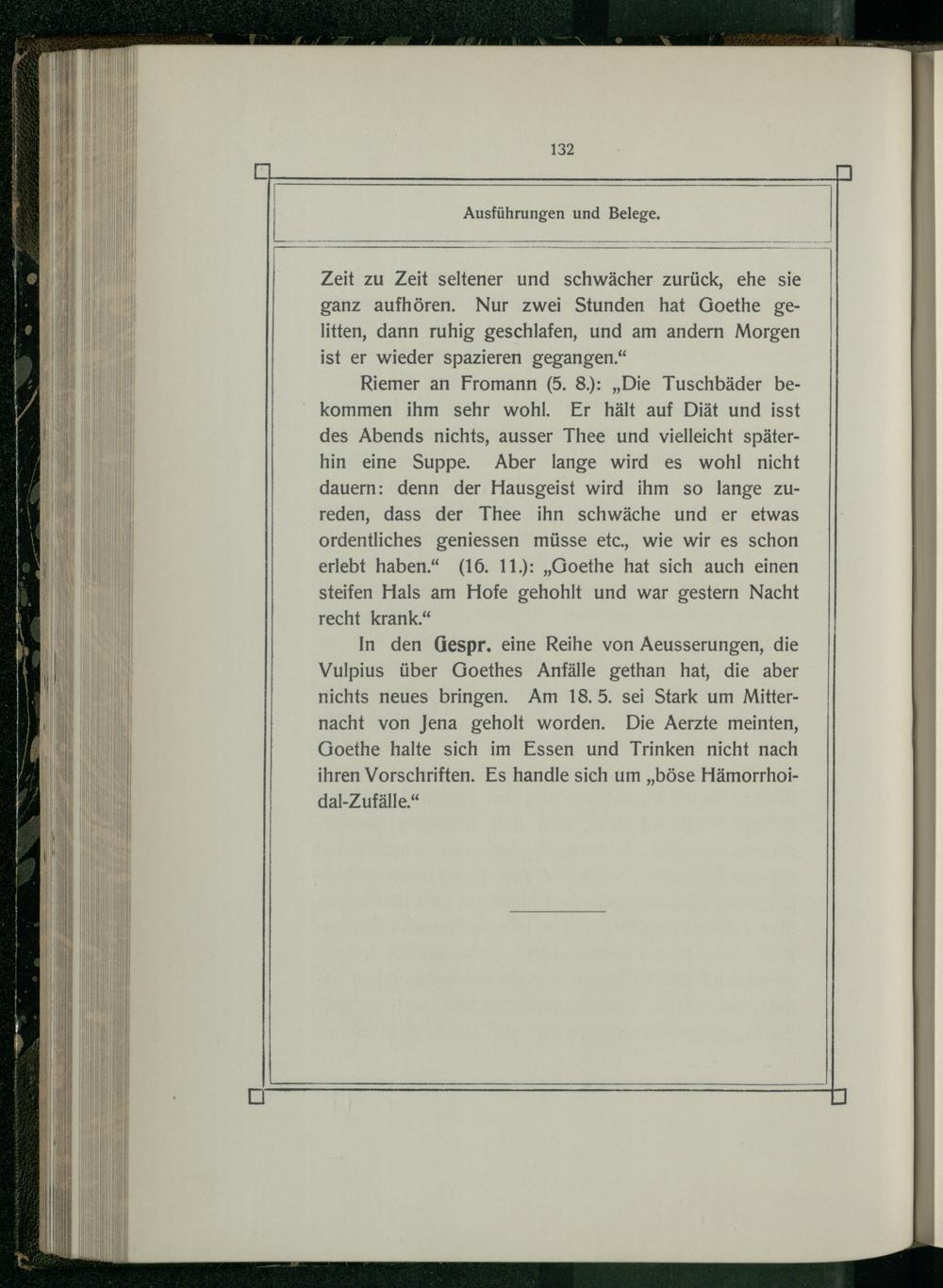In den Gespr. eine Reihe von Aeusserungen, die Vulpius über Goethes Anfälle gethan hat, die aber nichts neues bringen. Am 18.5. sei Stark um Mitternacht von Jena geholt worden. Die Aerzte meinten, Goethe halte sich im Essen und Trinken nicht nach ihren Vorschriften. Es handle sich um„böse Hämorrhoidal-Zufälle.“