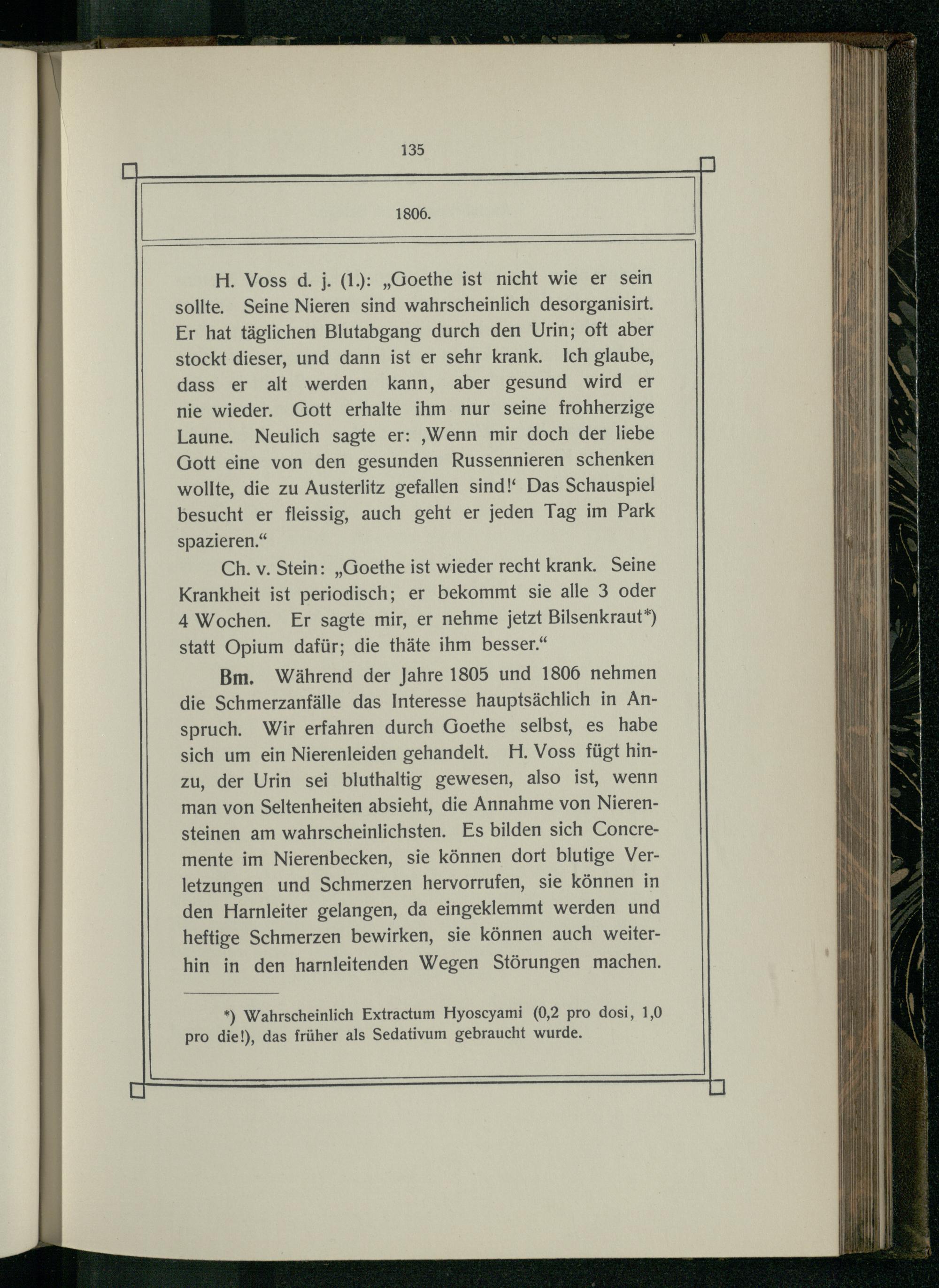 Bm. Während der Jahre 1805 und 1806 nehmen die Schmerzanfälle das Interesse hauptsächlich in Anspruch. Wir erfahren durch Goethe selbst, es habe sich um ein Nierenleiden gehandelt. H. Voss fügt hinzu, der Urin sei bluthaltig gewesen, also ist, wenn man von Seltenheiten absieht, die Annahme von Nierensteinen am wahrscheinlichsten. Es bilden sich Concremente im Nierenbecken, sie können dort blutige Verletzungen und Schmerzen hervorrufen, sie können in den Harnleiter gelangen, da eingeklemmt werden und heftige Schmerzen bewirken, sie können auch weiterhin in den harnleitenden Wegen Störungen machen.