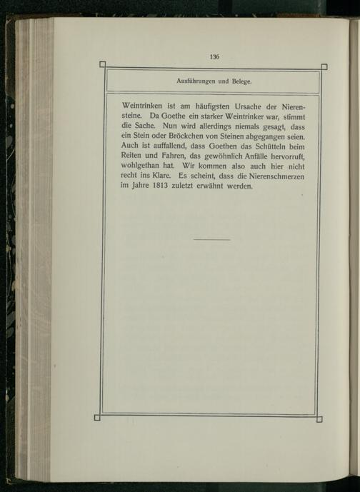 Weintrinken ist am häufigsten Ursache der Nierensteine. Da Goethe ein starker Weintrinker war, stimmt die Sache. Nun wird allerdings niemals gesagt, dass ein Stein oder Bröckchen von Steinen abgegangen seien. Auch ist auffallend, dass Goethen das Schütteln beim Reiten und Fahren, das gewöhnlich Anfälle hervorruft, wohlgethan hat. Wir kommen also auch hier nicht recht ins Klare. Es scheint, dass die Nierenschmerzen im Jahre 1813 zuletzt erwähnt werden.