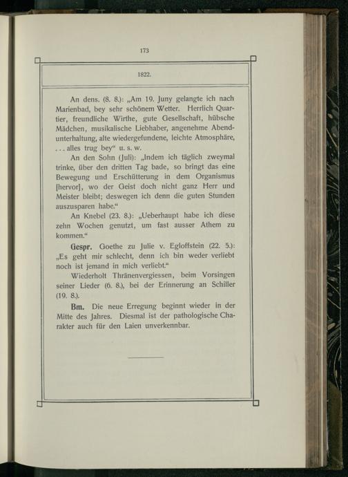 An dens.(8. 8.):„Am 19. Juny gelangte ich nach Marienbad, bey sehr schönem Wetter. Herrlich Quartier, freundliche Wirthe, gute Gesellschaft, hübsche Mädchen, musikalische Liebhaber, angenehme Abendunterhaltung, alte wiedergefundene, leichte Atmosphäre, 7.2. alles trug bey“ u. Ss. W.