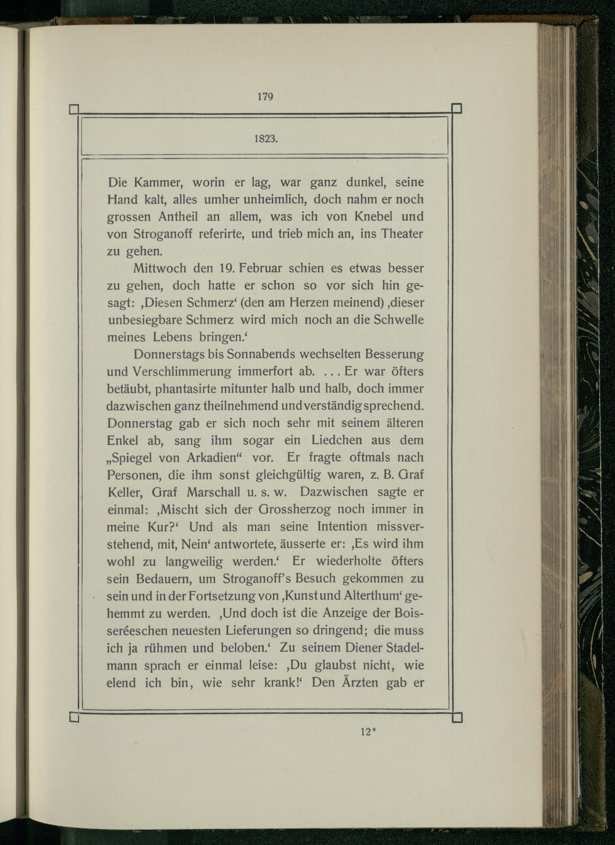 Donnerstags bis Sonnabends wechselten Besserung und Verschlimmerung immerfort ab....Er war öfters betäubt, phantasirte mitunter halb und halb, doch immer dazwischen ganz theilnehmend und verständig sprechend. Donnerstag gab er sich noch sehr mit seinem älteren Enkel ab, sang ihm sogar ein Liedchen aus dem „Spiegel von Arkadien“ vor. Er fragte oftmals nach Personen, die ihm sonst gleichgültig waren, z. B. Graf Keller, Graf Marschall u. s. w. Dazwischen sagte er einmal: ‚Mischt sich der Grossherzog noch immer in meine Kur?‘ Und als man seine Intention missverstehend, mit, Nein‘ antwortete, äusserte er: ‚Es wird ihm wohl zu langweilig werden.‘ Er wiederholte öfters sein Bedauern, um Stroganoff’s Besuch gekommen zu sein und in der Fortsetzung von ‚Kunst und Alterthum‘ gehemmt zu werden. ‚Und doch ist die Anzeige der Boisser&eschen neuesten Lieferungen so dringend; die muss ich ja rühmen und beloben.‘ Zu seinem Diener Stadelmann sprach er einmal leise: ‚Du glaubst nicht, wie elend ich bin, wie sehr krank!‘ Den Ärzten gab er