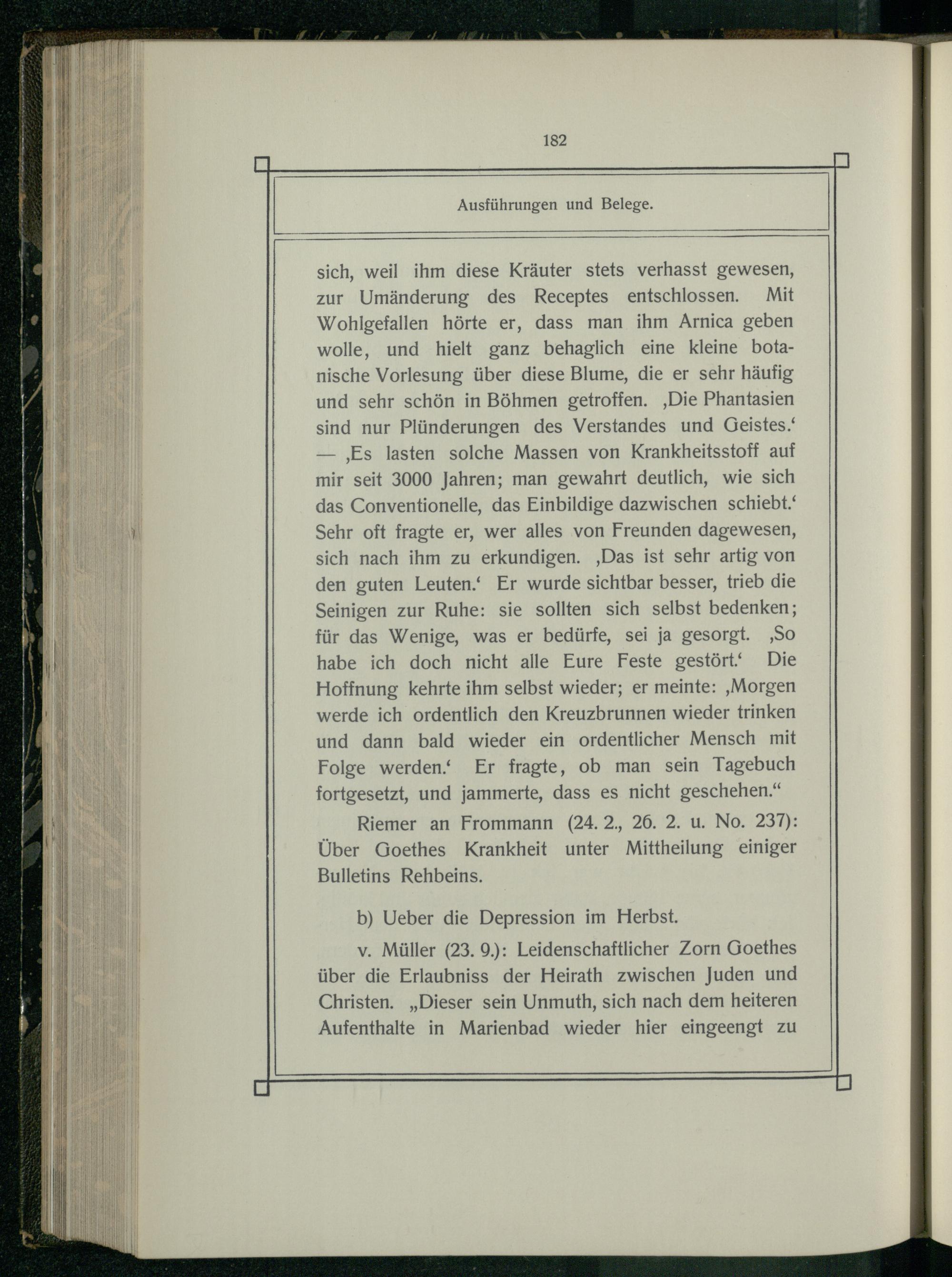v. Müller(23. 9.): Leidenschaftlicher Zorn Goethes über die Erlaubniss der Heirath zwischen Juden und Christen.„Dieser sein Unmuth, sich nach dem heiteren Aufenthalte in Marienbad wieder hier eingeengt zu