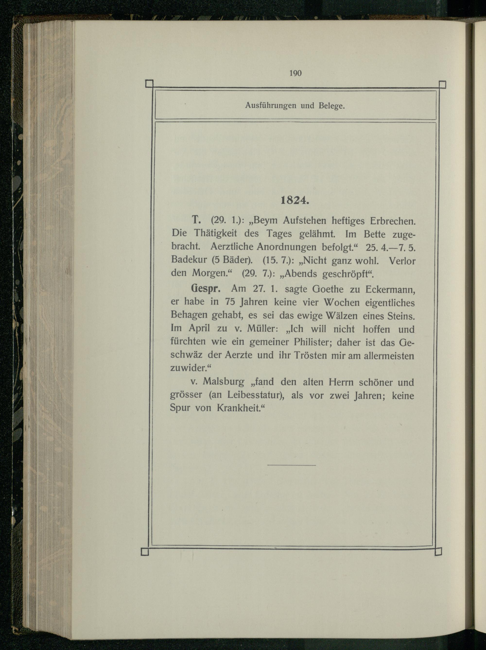 T.(29. 1.):„Beym Aufstehen heftiges Erbrechen. Die Thätigkeit des Tages gelähmt. Im Bette zugebracht. Aerztliche Anordnungen befolgt.“ 25. 4.—7. 5. Badekur(5 Bäder).(15. 7.):„Nicht ganz wohl. Verlor den Morgen.“(29. 7.):„Abends geschröpft“.