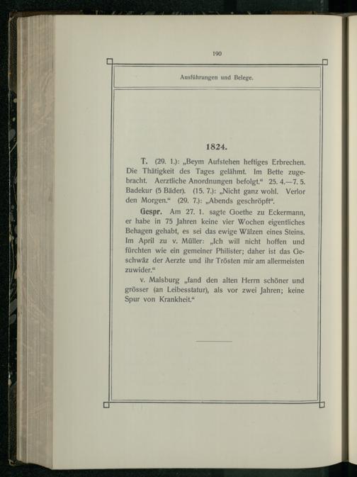Im April zu v. Müller:„Ich will nicht hoffen und fürchten wie ein gemeiner Philister; daher ist das Geschwäz der Aerzte und ihr Trösten mir am allermeisten zuwider.“