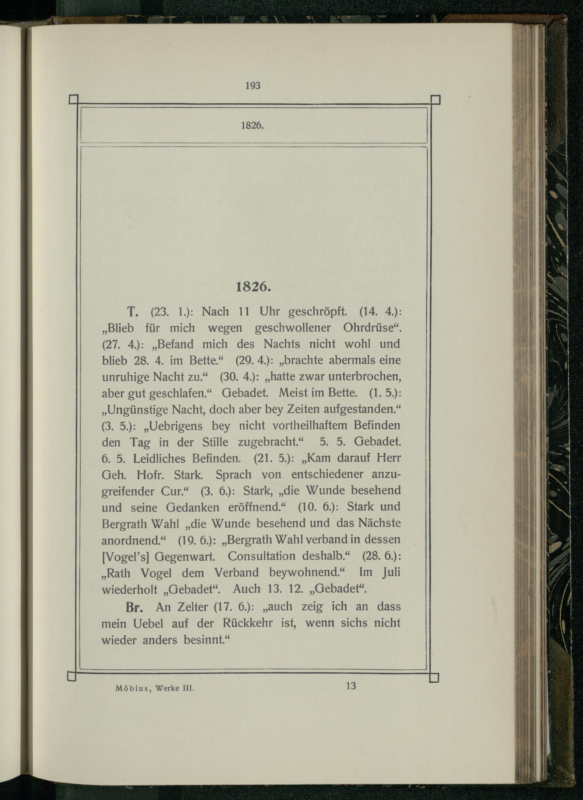 T. 03. 1.): Nach 11 Uhr geschröpit,(14. 4): „Blieb für mich wegen geschwollener Ohrdrüse“. (27. 4.):„Befand mich des Nachts nicht wohl und blieb 28. 4. im Bette.“(29. 4.):„brachte abermals eine unruhige Nacht zu.“(30. 4.):„hatte zwar unterbrochen, aber gut geschlafen.“ Gebadet. Meist im Bette.(1. 5.): „Ungünstige Nacht, doch aber bey Zeiten aufgestanden.“ (3. 5.):„Uebrigens bey nicht vortheilhaftem Befinden den Tag in der Stille zugebracht.“ 5. 5. Gebadet. 6. 5. Leidliches Befinden.(21. 5.):„Kam darauf Herr Geh. Hofr. Stark. Sprach von entschiedener anzugreifender Cur.“(3. 6.): Stark,„die Wunde besehend und seine Gedanken eröffnend.“(10. 6.): Stark und Bergrath Wahl„die Wunde besehend und das Nächste anordnend.“(19. 6.):„Bergrath Wahl verband in dessen [Vogel’s] Gegenwart. Consultation deshalb.“(28, 6.): „Rath Vogel dem Verband beywohnend.“ Im Juli wiederholt„Gebadet“. Auch 13. 12.„Gebadet“,